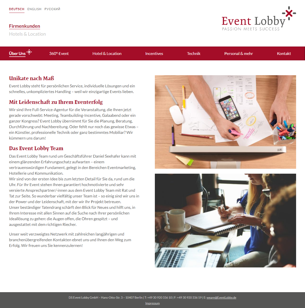 Event Lobby is a full-service event agency. The page content is in three languages: German, English, and Russian.