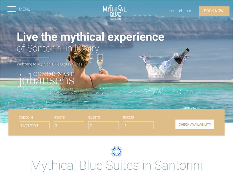 Mythical Blue Luxury Suites are located on the clifftops of Fira in Santorini. Featuring private hot tubs with amazing views of the caldera, the hotel is the perfect place for honeymooners! Built with WMPL and in English and Greek, more languages are planned to be added in the near future!