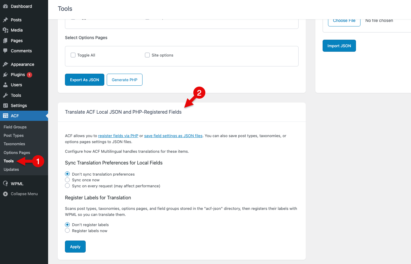 مرر للأسفل وصولاً إلى ترجمة حقول ACF Local JSON والحقول المسجلة في PHP .