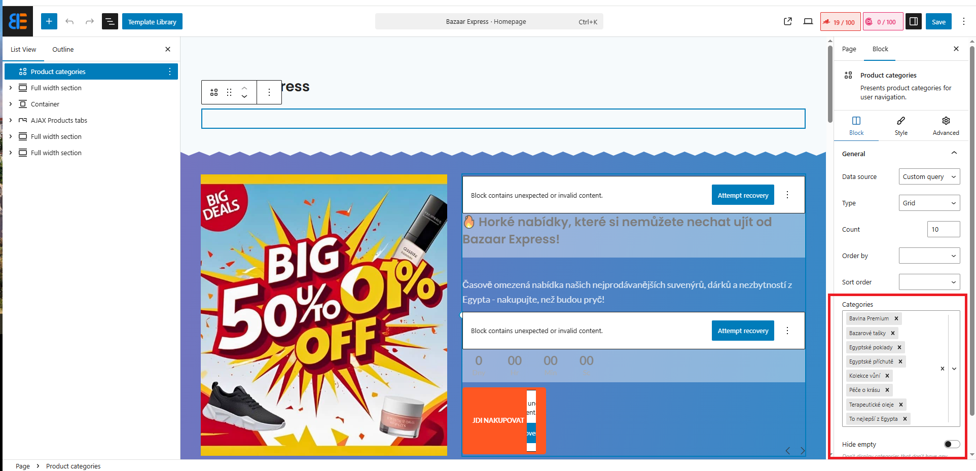 The product categories are not appearing in the hero section as they do on the original language page.