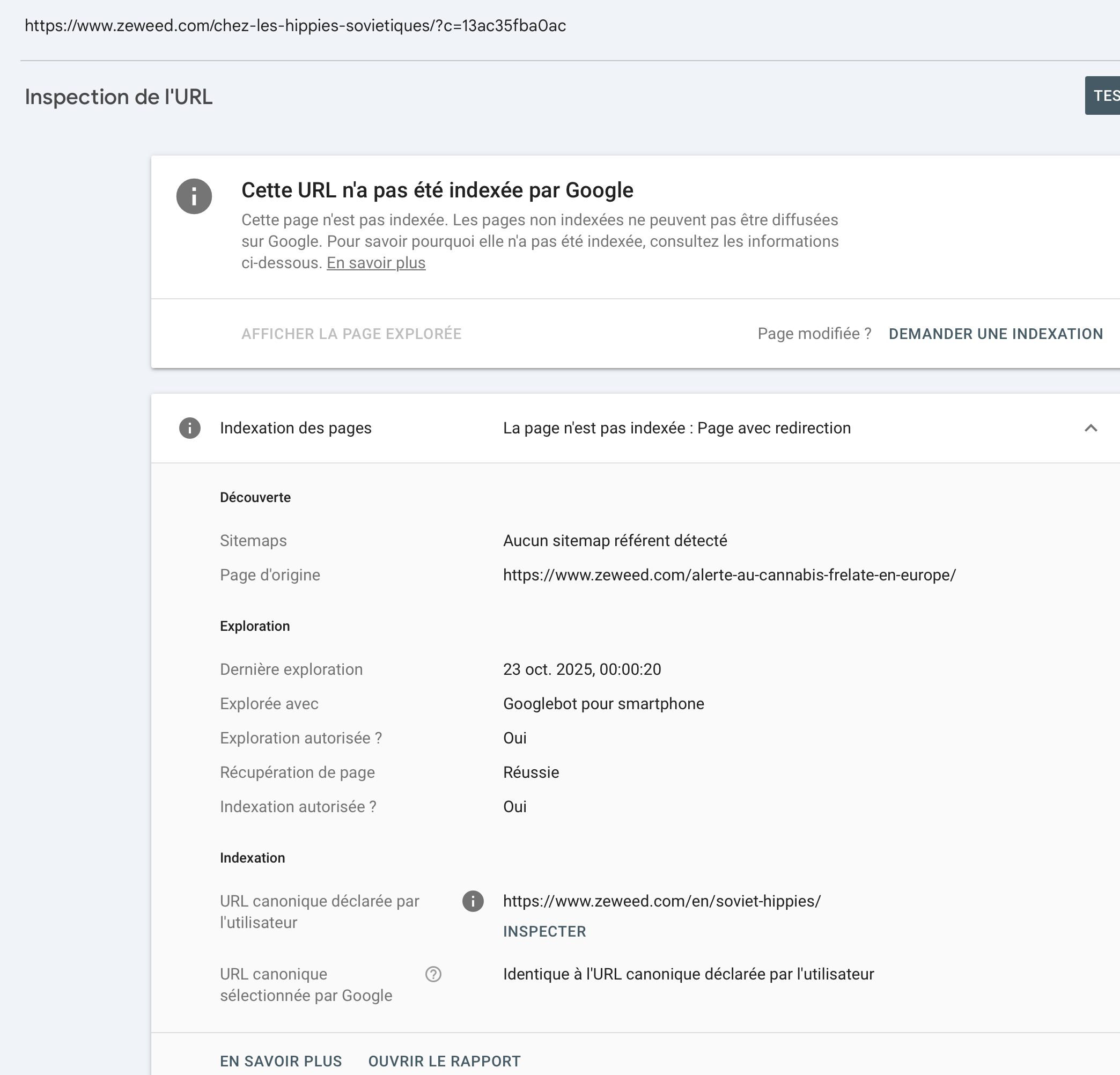 Après un nouveau test sur la Search Console, le problème n'est pas résolu. Google prend l'URL canonique en anglais alors que l'URL de l'article est en français.