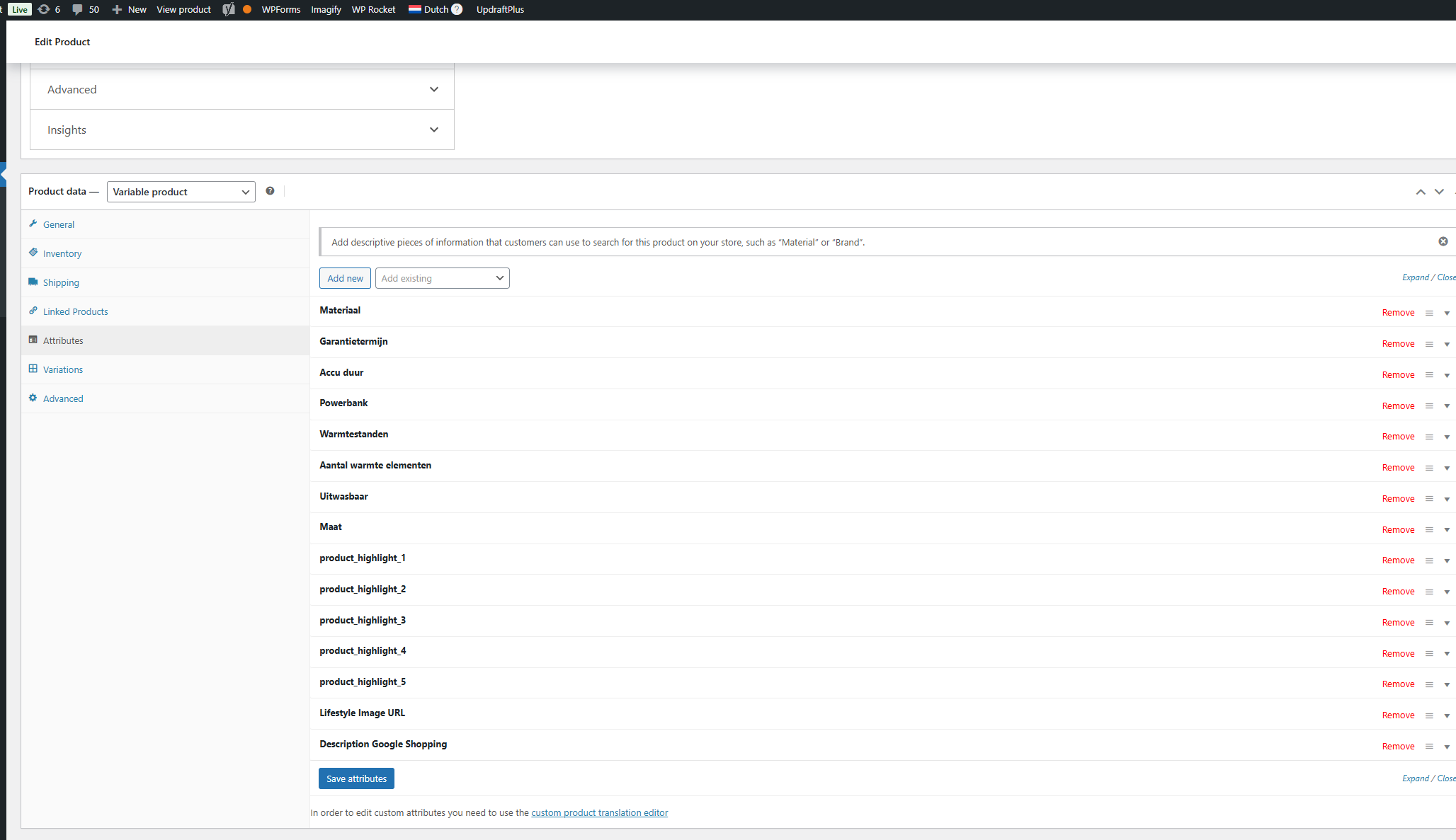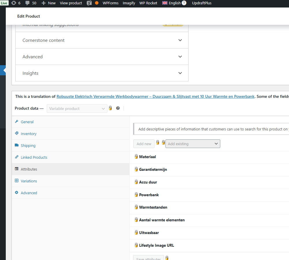 I am trying to import a translated product feed on magnetarheat.com, but the attributes are not showing on the webshop. I noticed that attributes cannot be translated in the products editor, and WPML has another page for translating attributes. However, many attributes from the Dutch webshop are not visible there, preventing translation. I also couldn't translate this in the 'string translations'. Link to a page where the issue can be seen: versteckter Link
