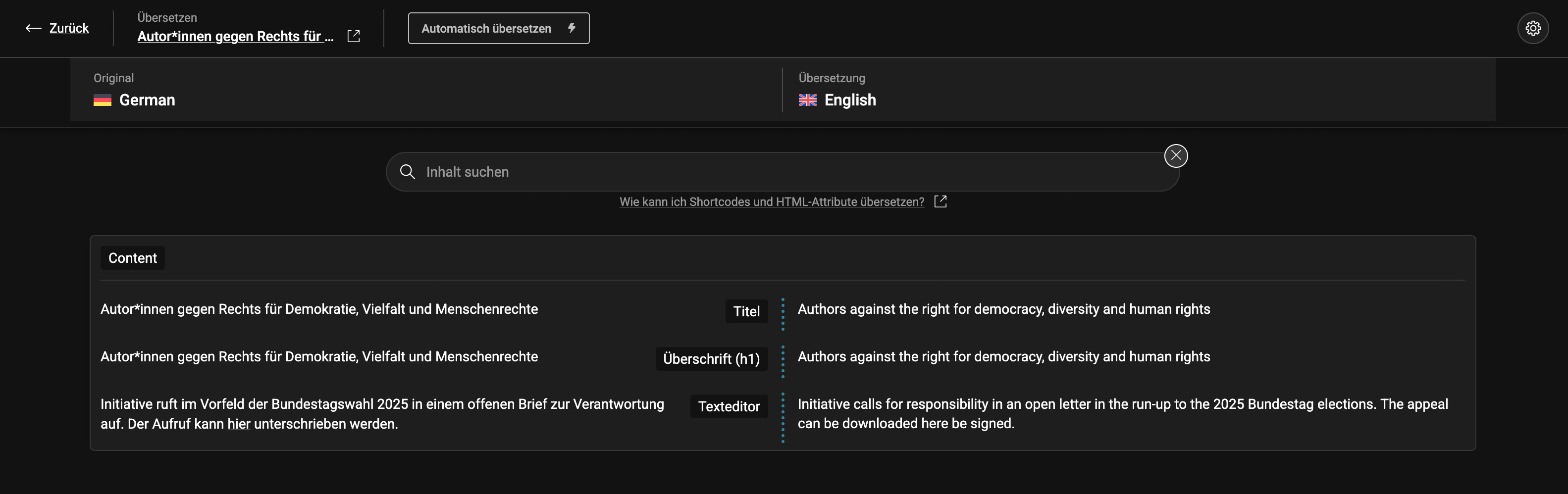 vielen Dank für dein Feedback. Nein, wir haben immer noch die automatische Übersetzung ausgewählt. Wie in den Screenshots zu sehen, kann ich einmal den Titel und die Überschrift übersetzen, bei dem anderen Beitrag, der genau den identischen Aufbau hat, nicht. Woran kann es noch liegen?