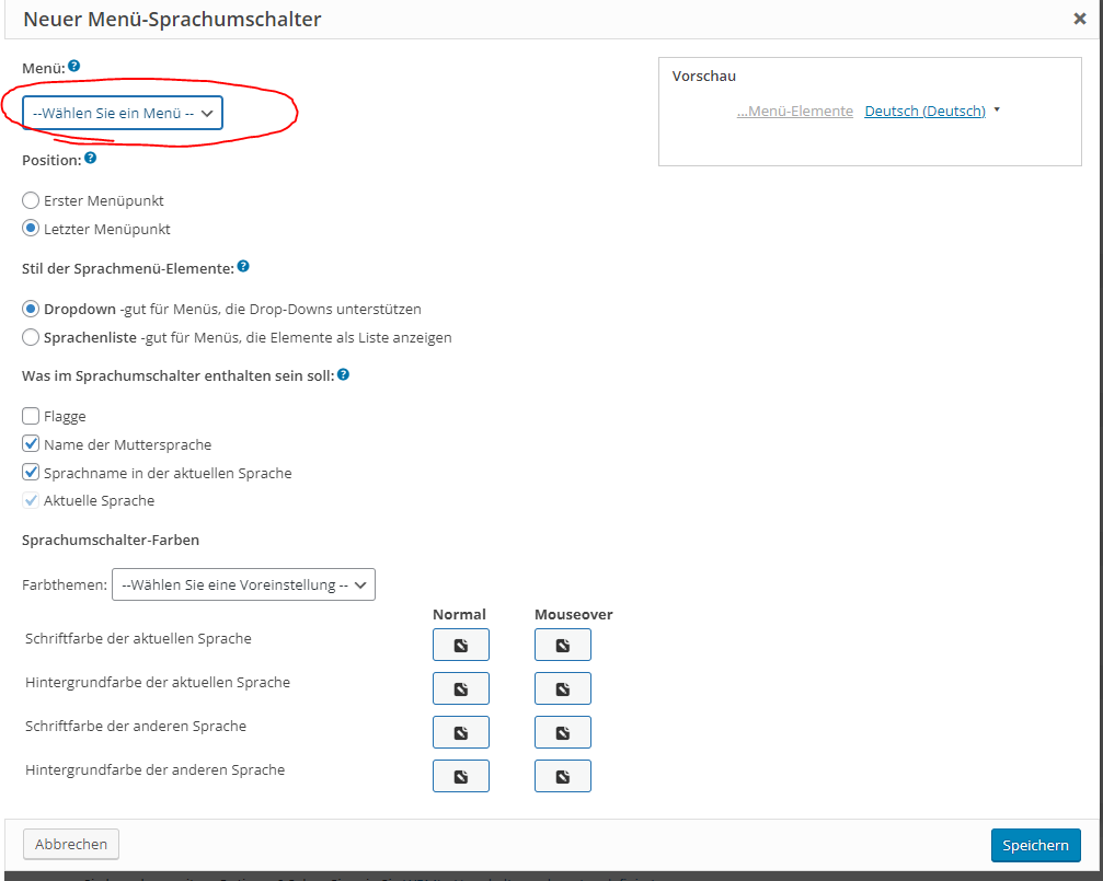 Sie können kein Menü für den Sprachumschalter auswählen, da es immer auf die Standardoption 'Menü auswählen' zurückgesetzt wird.