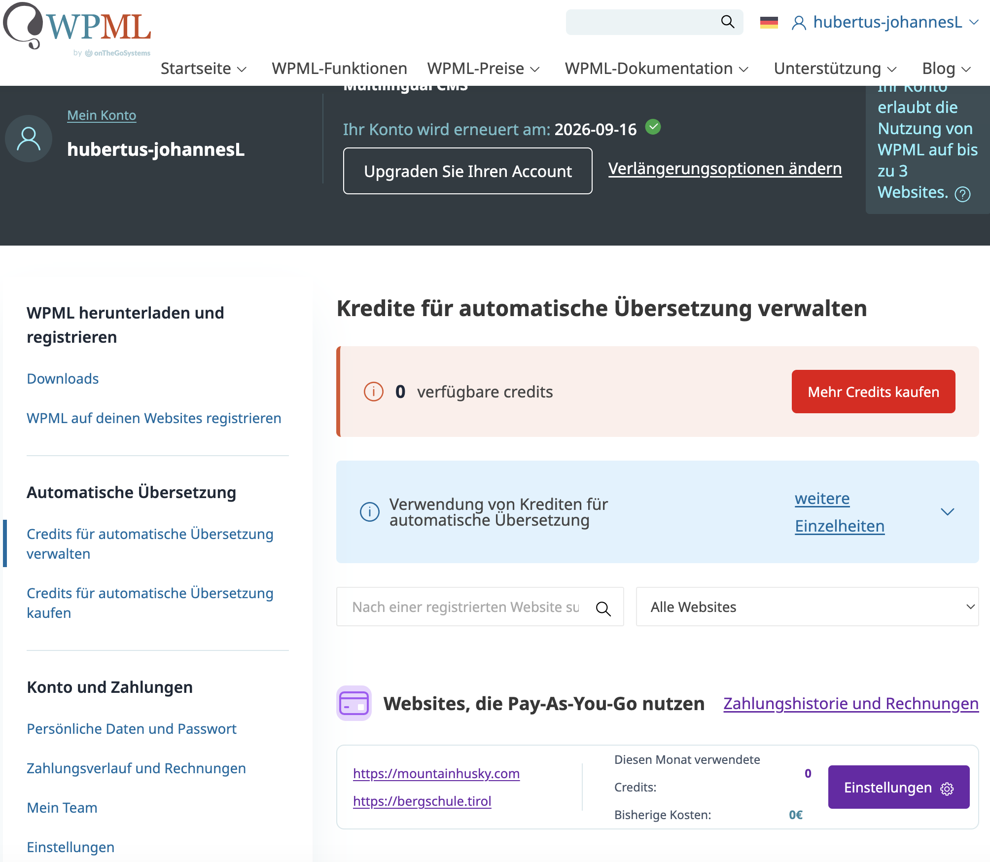 Ich habe vor 48 Stunden die Seite bergschule.tirol in WordPress aufgesetzt und WPML installiert und aktiviert. Es wurden keine Übersetzungen vorgenommen. Unser Abonnement vom Sep.2025 sollte 90.000 Credits bereitstellen. In unserem WPML-Account wird lediglich die Seite mountainhusky.com übersetzt. Diese Seite ist sehr klein und verbraucht unmöglich 90tsd. credits. Leider können wir auf die Credits nicht zugreifen. Bitte um Lösung und Rückmeldung! Link zur Seite: versteckter Link