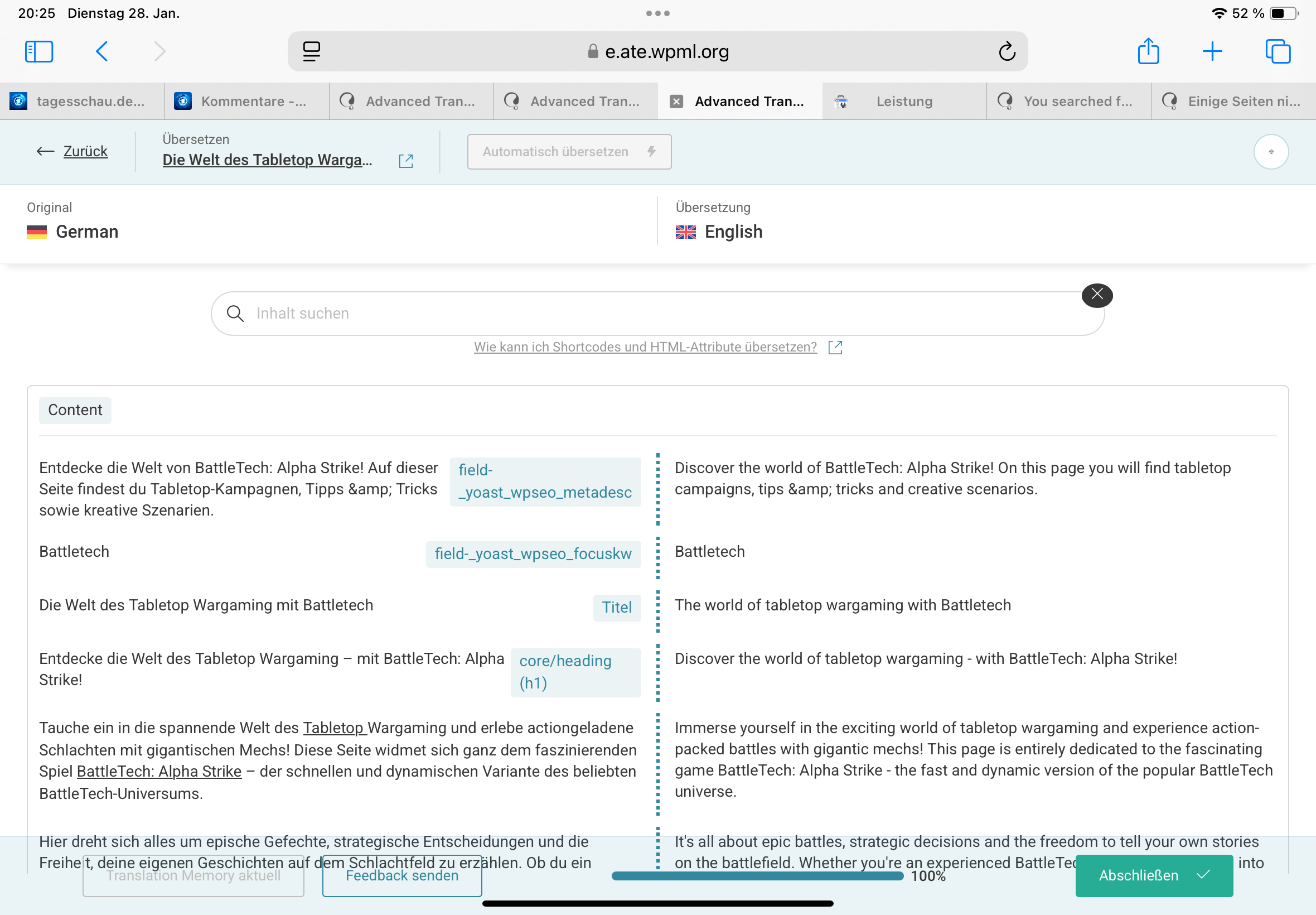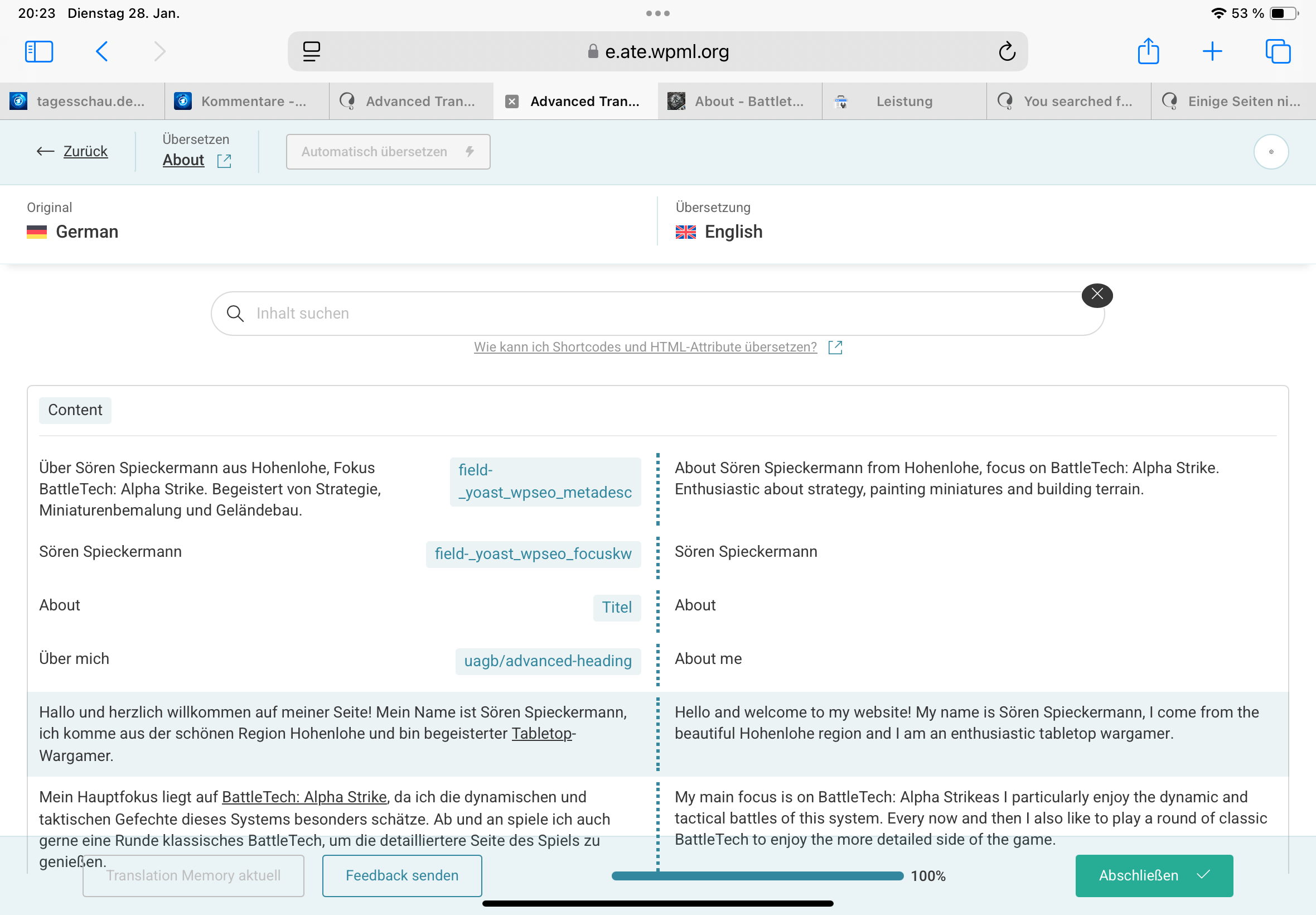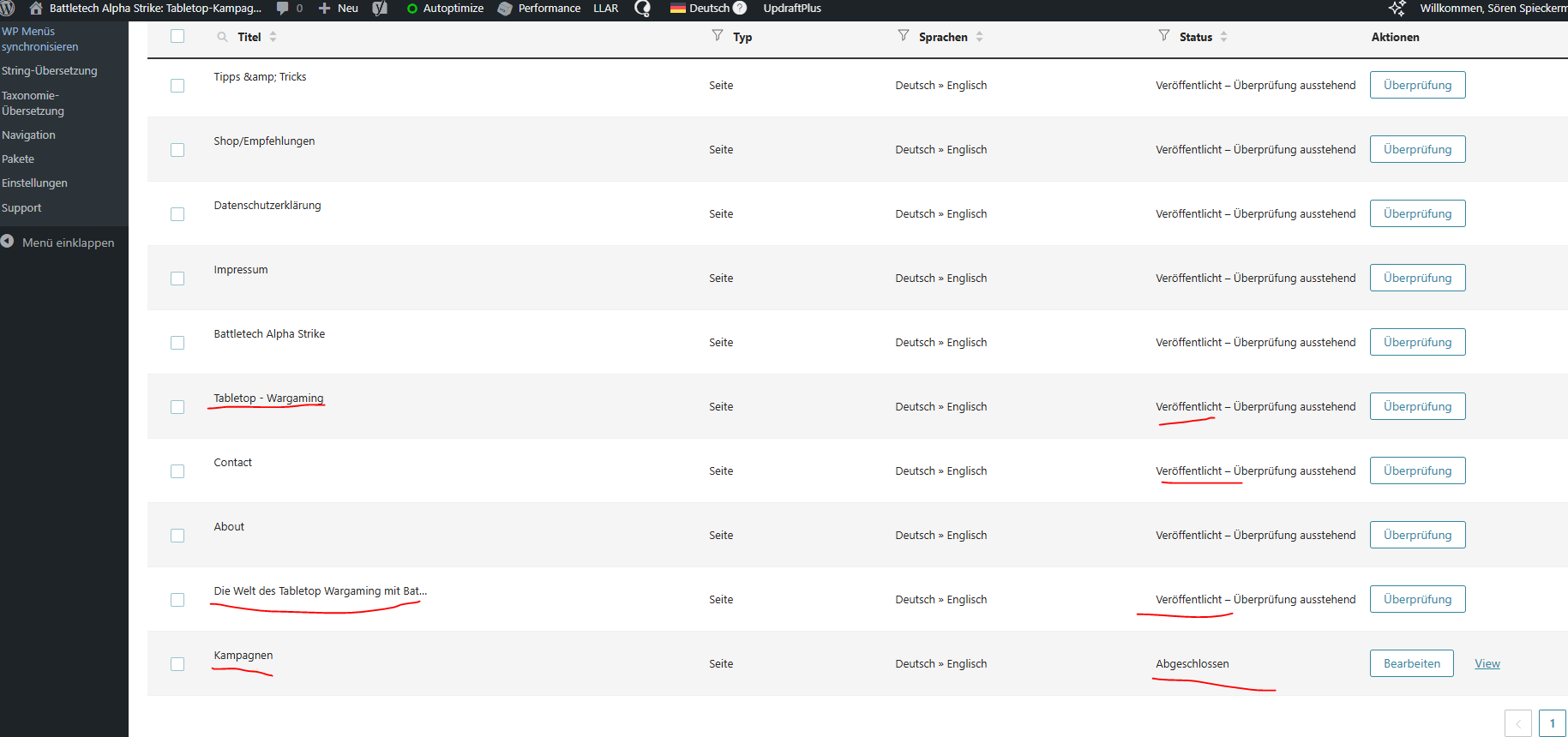 Ich versuche, bestimmte Seiten auf meiner Website zu übersetzen, insbesondere solche, die im Menü ganz oben stehen, wie die Startseite, Kampagnen/Campaigns, Battletech - Alpha Strike und Tabletop – Wargaming. Der Link zur Seite, auf der das Problem zu sehen ist: versteckter Link