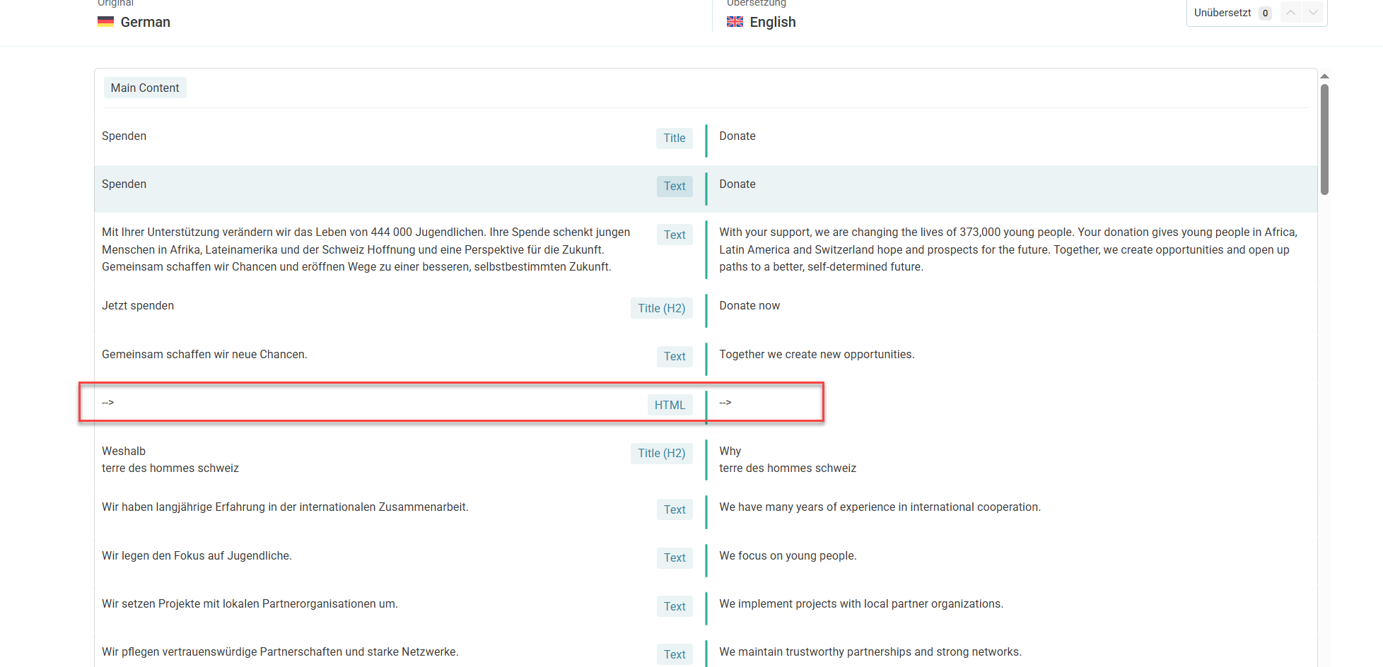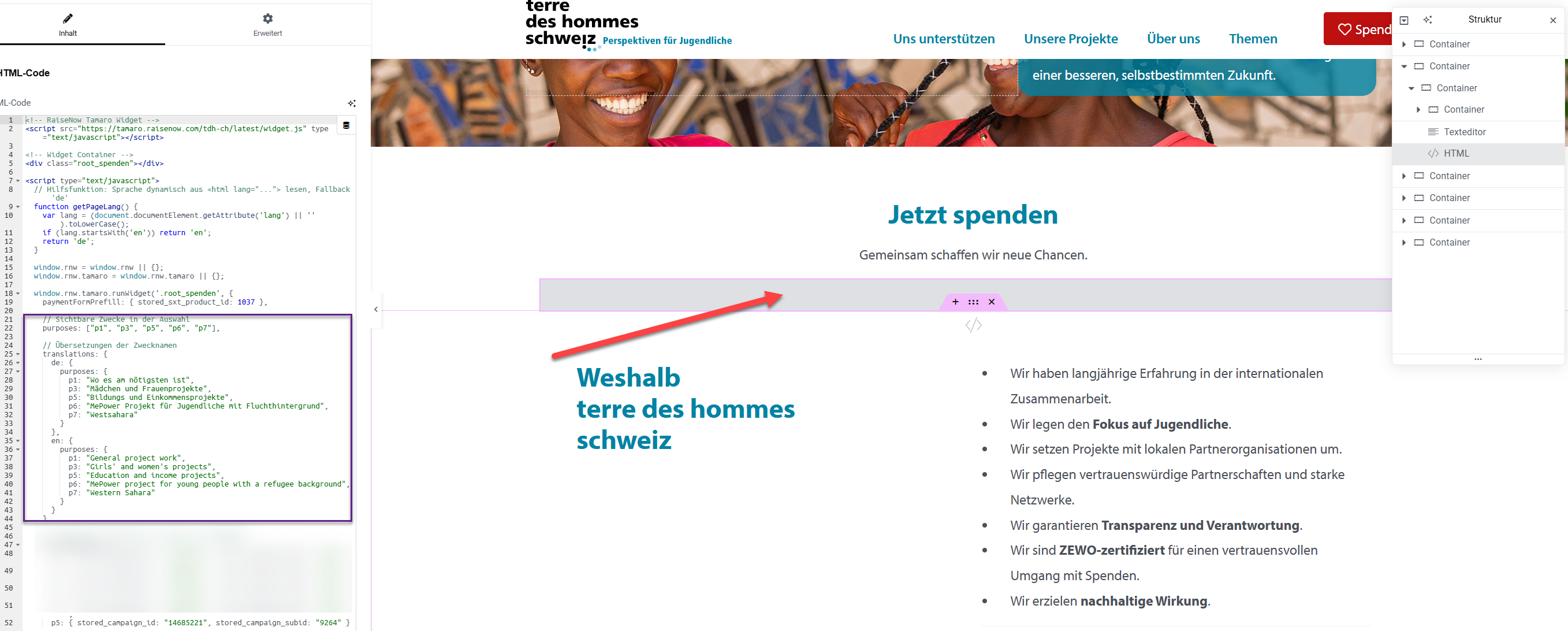 Die englische Übersetzung der Spendenseite zeigt Elementor Shortcodes und das Tamaro-Widget auf Deutsch, weil WPML oder Elementor das Sprachattribut (lang) nicht korrekt übergeben. Das ursprüngliche Script konnte nicht korrekt gelesen werden, was zu Anzeigeproblemen führte.