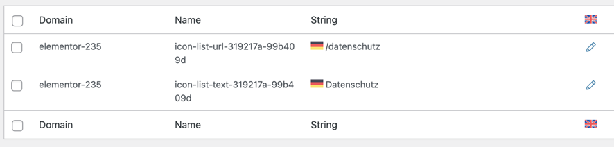 Sie haben versucht, den Footer Ihrer Website, der mit dem Elementor Footer Builder erstellt wurde, per String-Übersetzung zu übersetzen. Der deutsche Text wird jedoch im Frontend nicht angezeigt und bleibt auf Englisch.