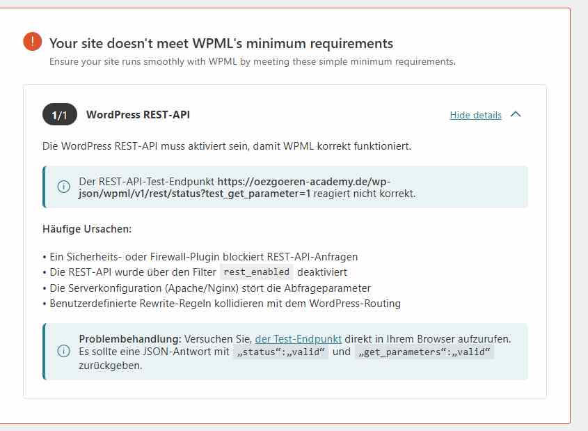Falls der 500-Fehler erneut auftritt, versuchen Sie bitte die hier beschriebenen Schritte: Bezüglich der Mindestanforderungen der REST-API: Wir haben mindestens zwei Szenarien identifiziert, in denen diese Warnung angezeigt wird, obwohl alles ordnungsgemäß funktioniert. Beide Fälle werden derzeit von unserem Entwicklungsteam bearbeitet. Wenn der REST-API-Endpunkt korrekt funktioniert, können Sie diese Warnung bis zur Veröffentlichung einer dauerhaften Lösung (voraussichtlich in WPML 4.9) ignorieren. Wenn Sie möchten, kann ich Ihnen in der Zwischenzeit auch zwei temporäre Workarounds zusenden, die anderen Kunden bereits geholfen haben. |