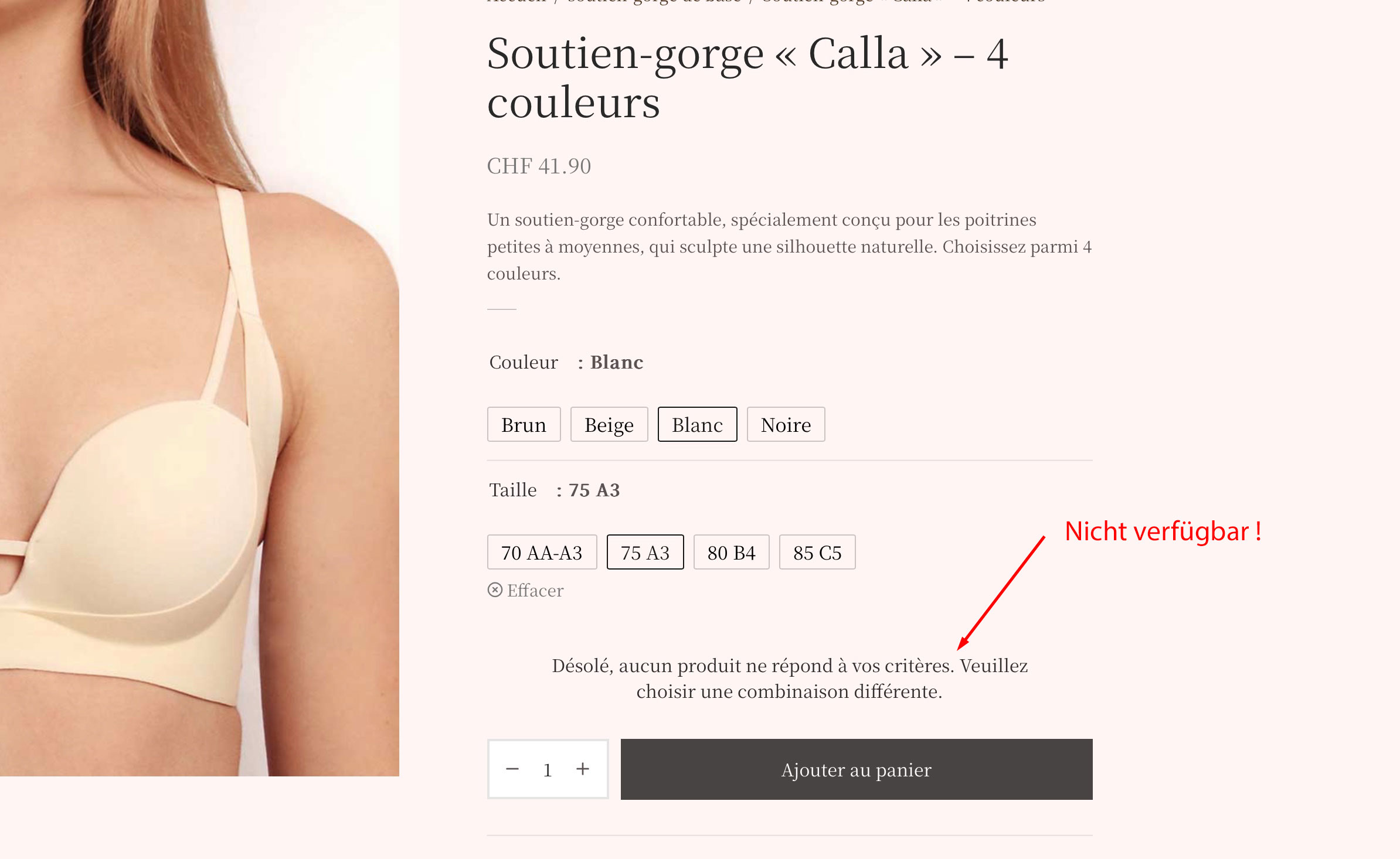 3) Im Frontend werden zwar die neuen Variationen angezeigt, aber weil die Lagerbestände fehlen (und zwar in DE, EN und FR) wird dem Kunden beim Bestellvorgang das Produkt wiederum als "Nicht lieferbar" angezeigt (siehe Screenshot). Dies ist natürlich nicht überraschend, da im Backend die neuen Variationen keine Lagerbestände haben.