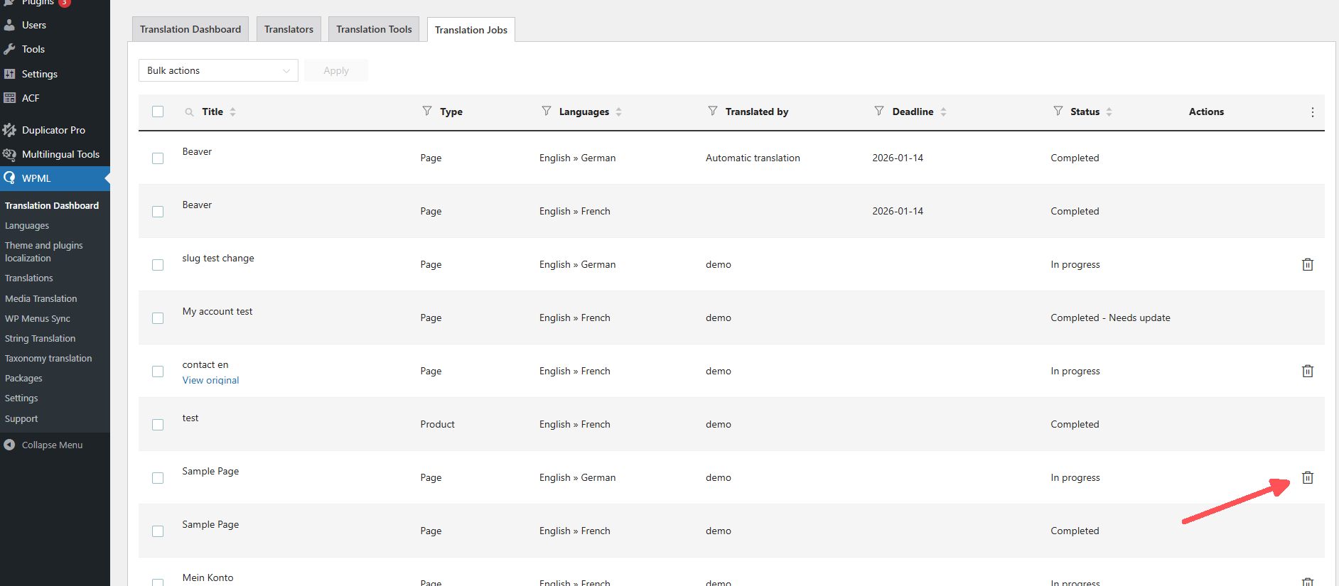 Bei uns ist die Seite jedoch auch nicht unter "WPML » Übersetzungsmanagement » Translation Jobs", sondern unter WPML » Übersetzungen.
