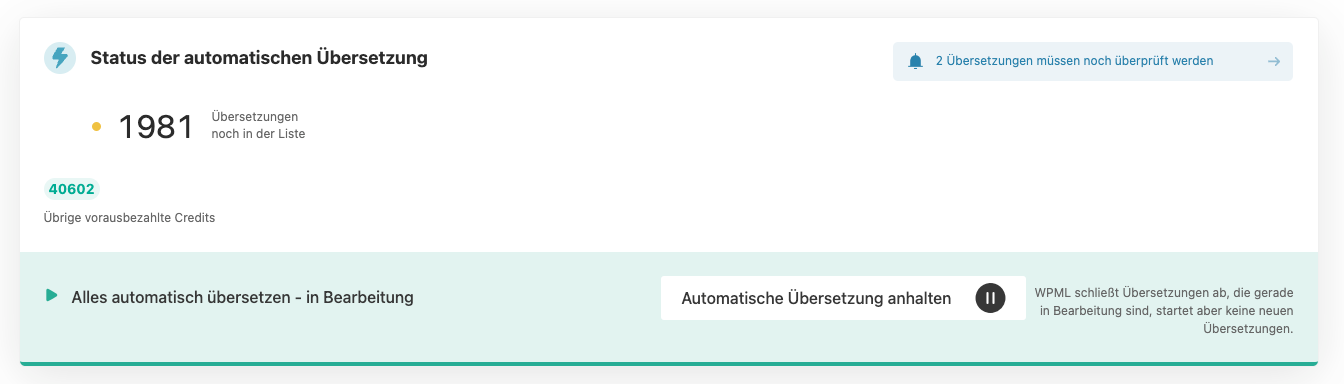 Sie haben nicht erwähnt, dass ein neuer Auftrag gestartet wurde. Haben Sie den geprüft, was exakt nicht übersetzt ist? Denn die Filter "Nicht übersetzt" & "Nicht übersetzt oder bedarf eines Updates" zeigen keine fehlenden Übersetzungen.