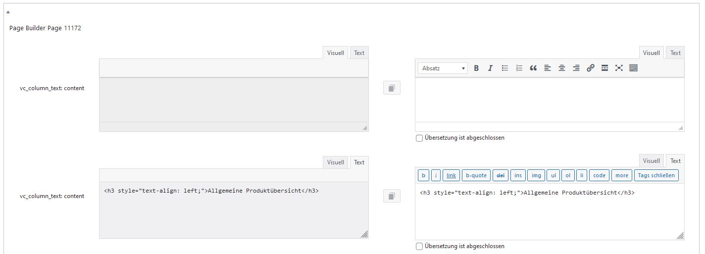 Ich habe diese Config nun unter WPML > Einstellungen > Benutzerdefinierte XML Konfigurierung hinterlegt und Du kannst die Links nun übersetzen, musst aber ggfls. die originalen Links zuerst auf den originalen Inhalten editieren und dann den Inhalt nochmals Ein weiteres Problem ist hier, dass der Page Builder diese Links URL-Encoded und deshalb werden sie wie folgt im Übersetzungseditor angezeigt: %7B%22url%22%3A%22%2Fablaengmaschinen%2F%22%7D Dies ist ein Problem, welches ich replizieren und dann intern eskalieren muss. 4) Bei einigen Seiten wird das Bild im Header nicht angezeigt. Ich habe dieses Problem auf ein neues Ticket aufgeteilt und werde mich auf diesem so bald wie möglich dazu bei Dir melden. Mit freundlichen Grüßen |