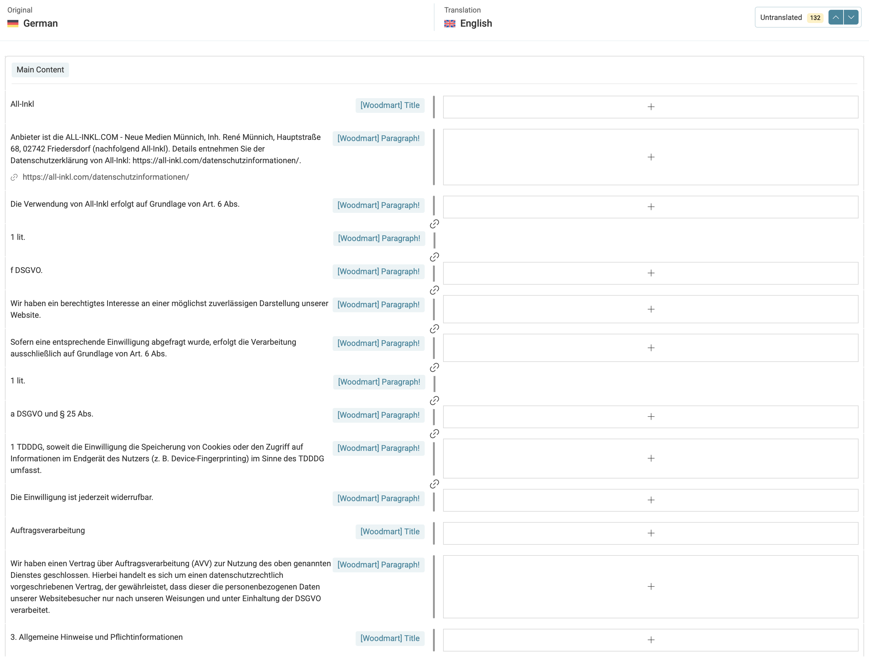 Allerdings scheint das Problem auf meiner Seite erneut aufzutreten, wenn man die Originalsprache wieder aktualisiert und den Übersetzungseditor öffnet. Die Absätze werden in mehrere Sätze oder gar Wörter unterteilt. Das betrifft hauptsächlich Absätze, in denen Inhalte wie „…von Art. 6 Abs. 1 lit. a DSGVO und…“ vorkommen. Der Workaround mit dem Leerzeichen hinter den betroffenen Absätzen scheint auch nicht immer zu funktionieren. Das ist äußerst frustrierend – ich kann die Übersetzung der Seite nicht abschließen. |