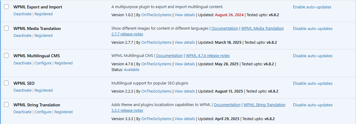 Sollte keine Updates angezeigt werden, dann ist WPML vermutlich nicht korrekt registriert.