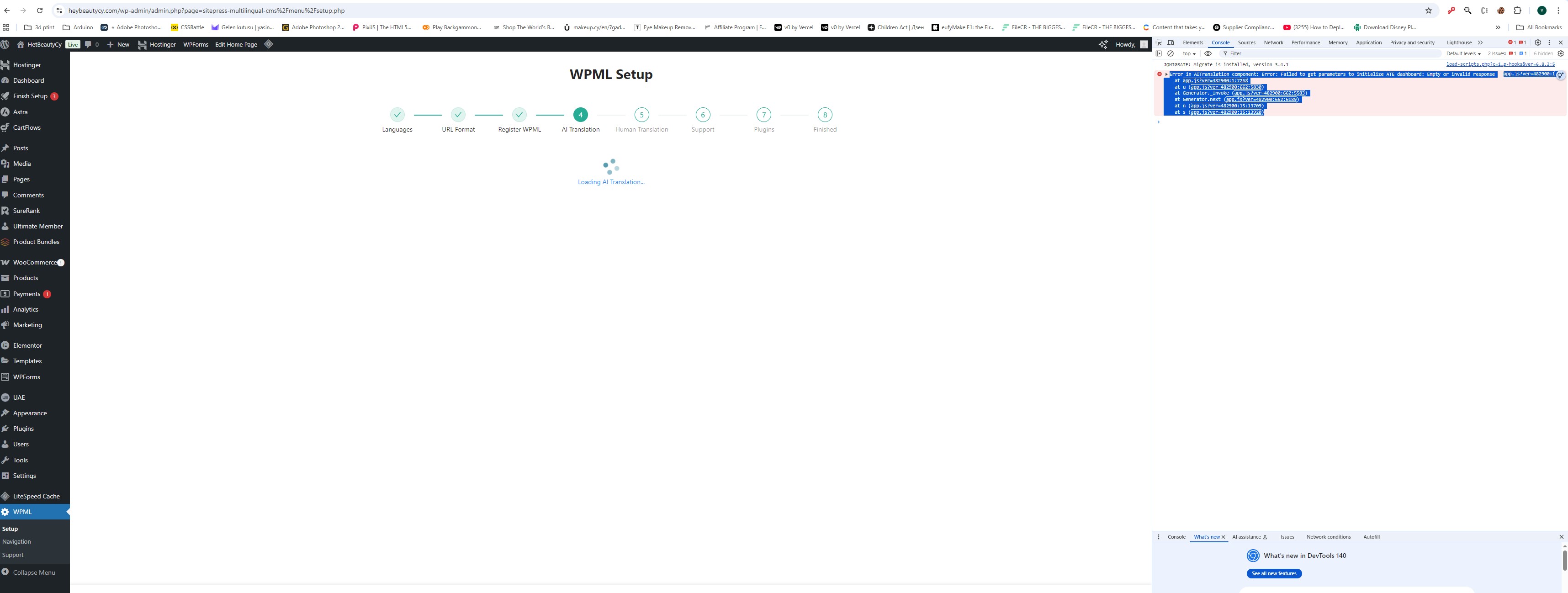 I am trying to complete the setup for WPML on my site versteckter Link. I keep getting stuck on AI Translation, which I don't even need. I have disabled all plugins, but still no luck. The response from versteckter Link is {"success":false,"data":"ATE is not enabled for this client."}, and the console log gives an error in the AITranslation component: Error: Failed to get parameters to initialize ATE dashboard: Empty or invalid response.