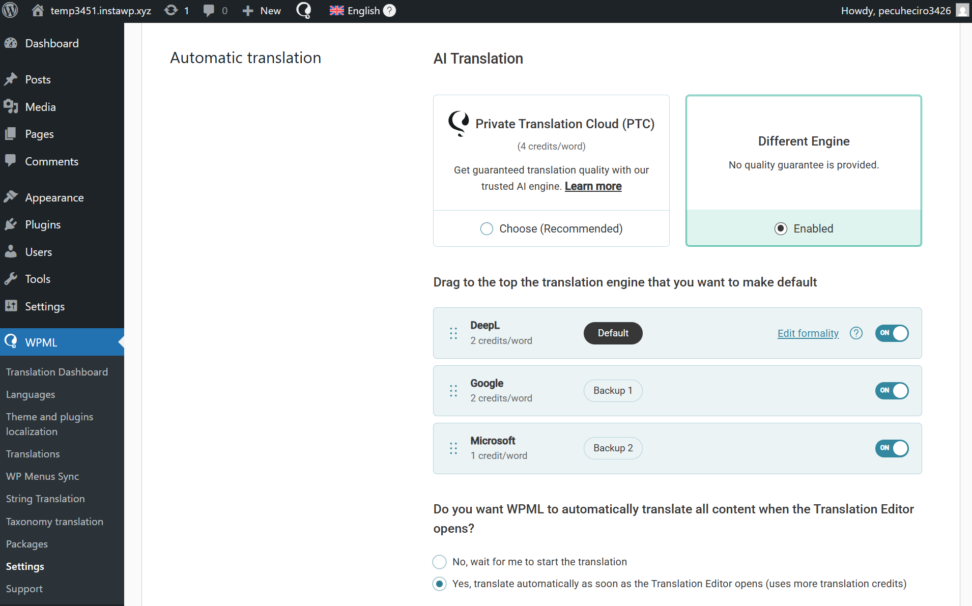 By default, WPML uses PTC when translating your content. However, you can change to a different translation engine if you want to use another one.
