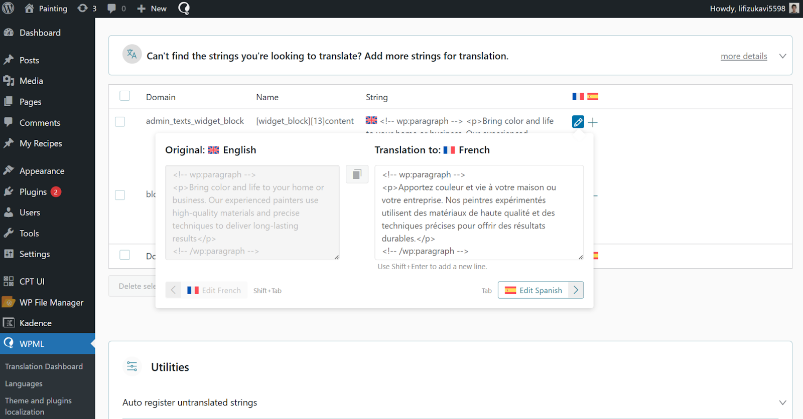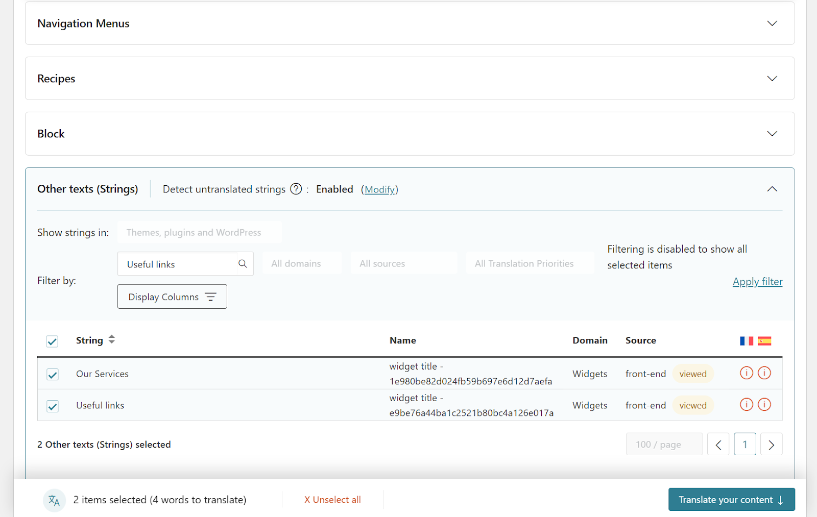 If you can’t find some texts in the Other texts (Strings) section, follow the steps below to translate them with String Translation: