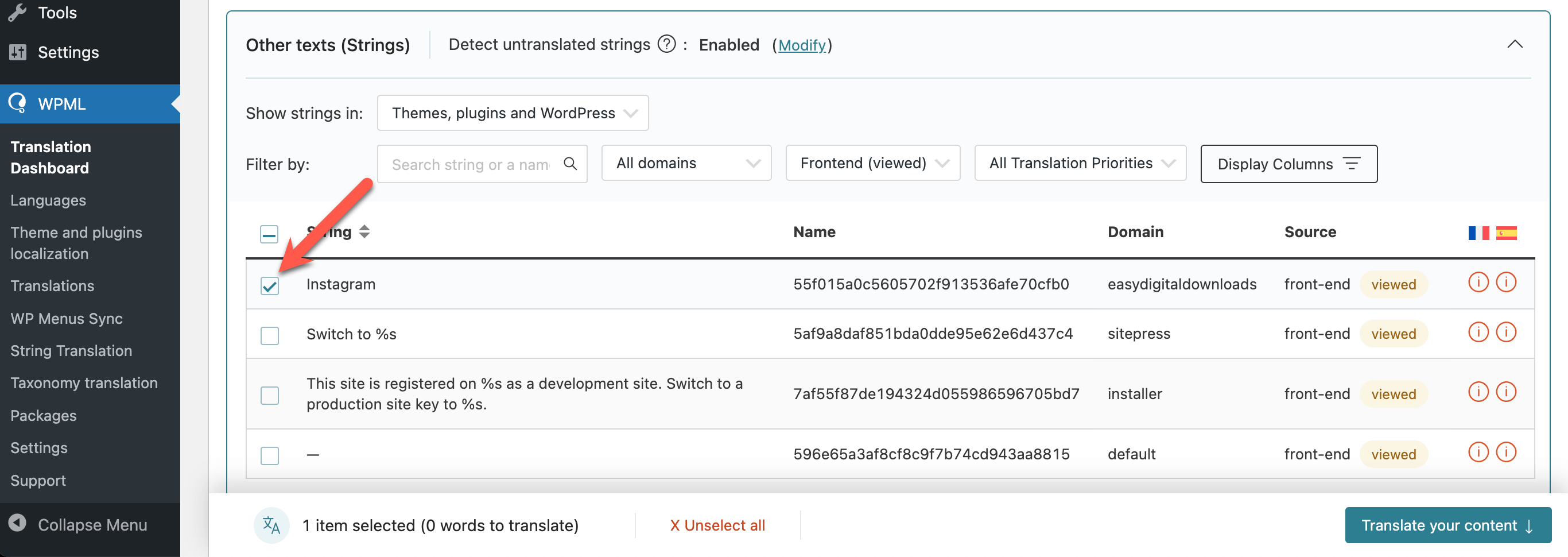 Scroll down to the Other texts (Strings) section and select the strings for translation.