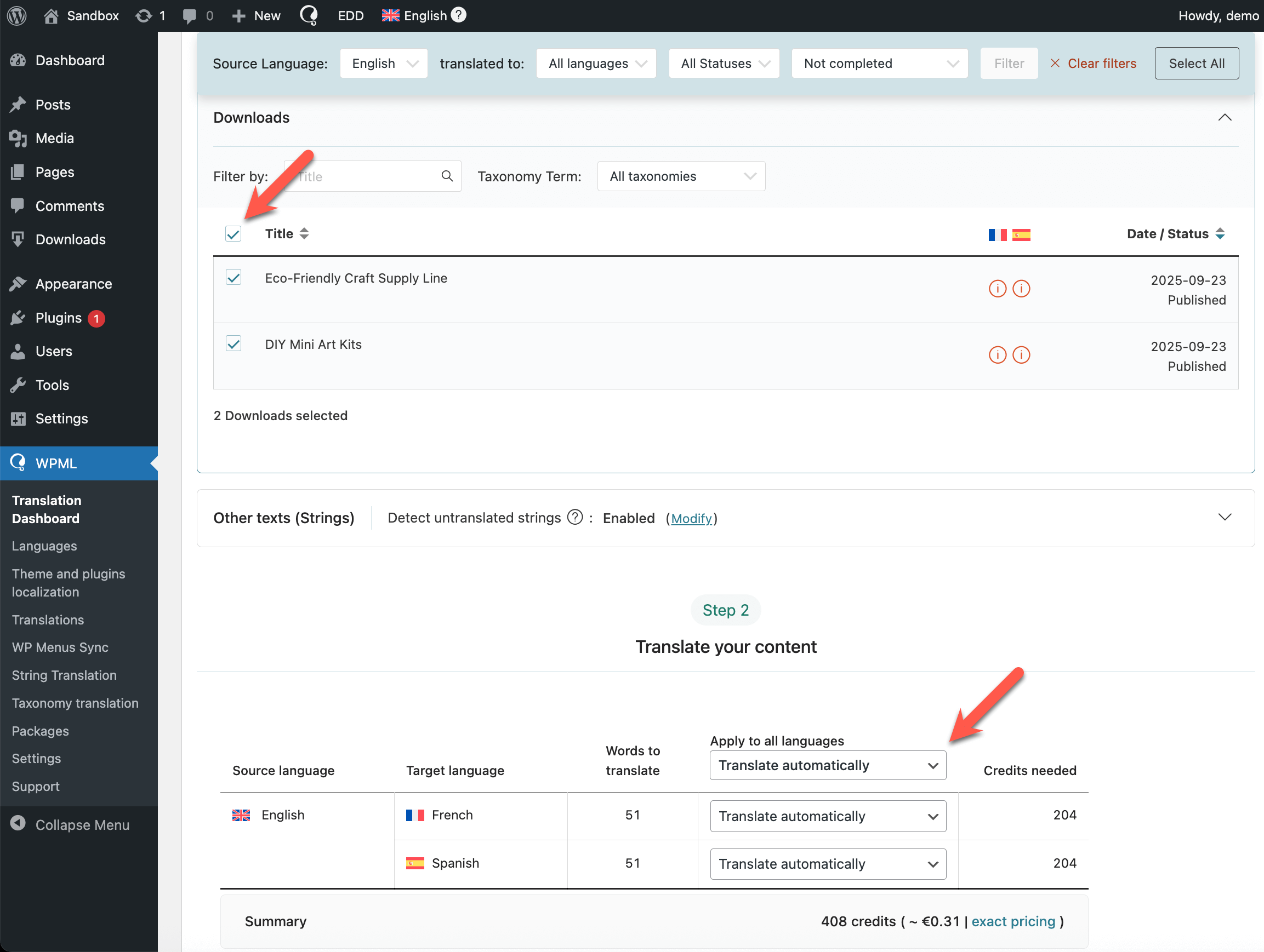 Selecting Easy Digital Downloads products (Downloads) for translation in the Translation Dashboard