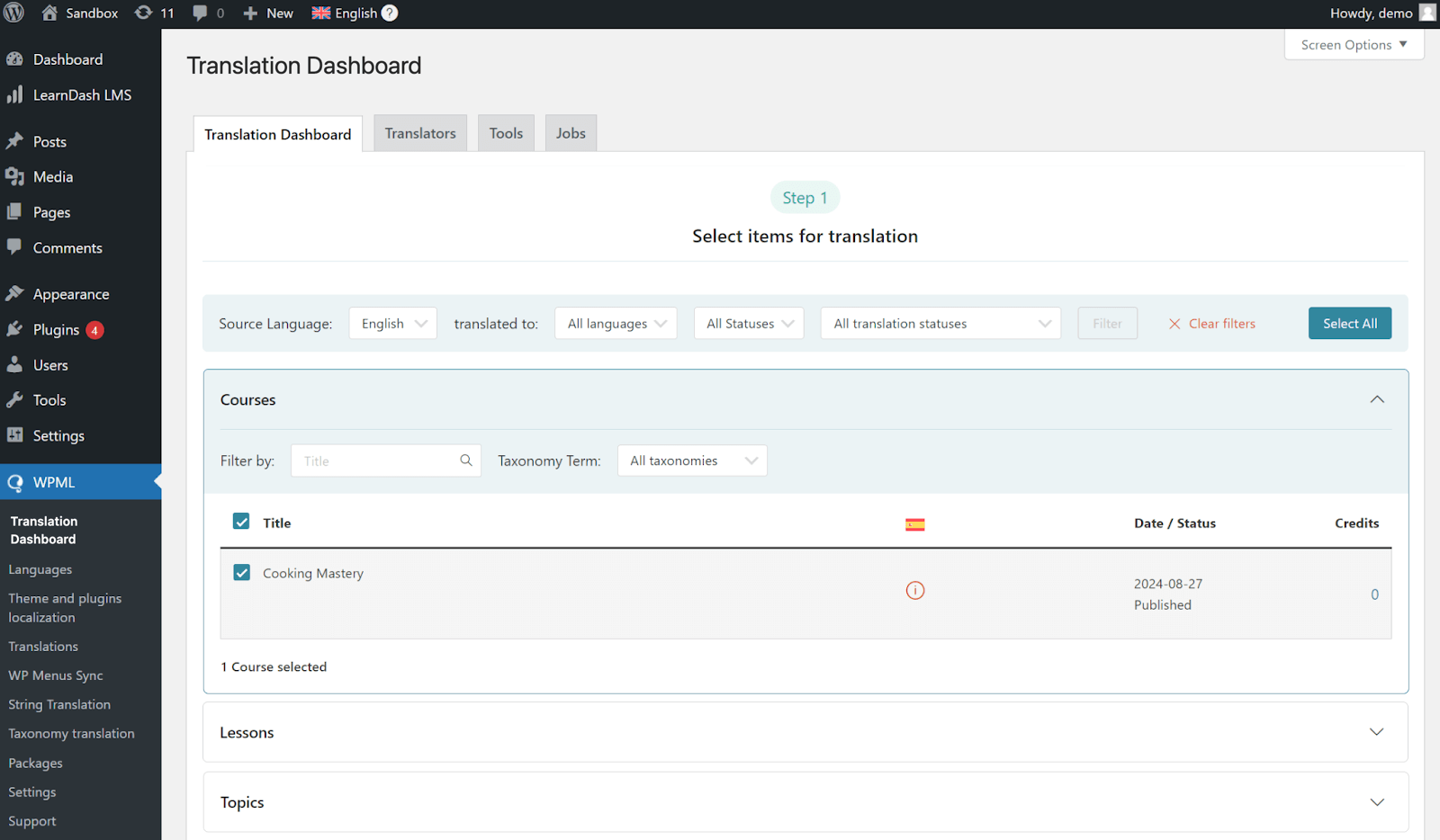 WPML can translate any LearnDash course component. This includes Lessons, Topics, Quizzes, and Questions, as well as standard WordPress pages. To translate your course, follow the three steps below.