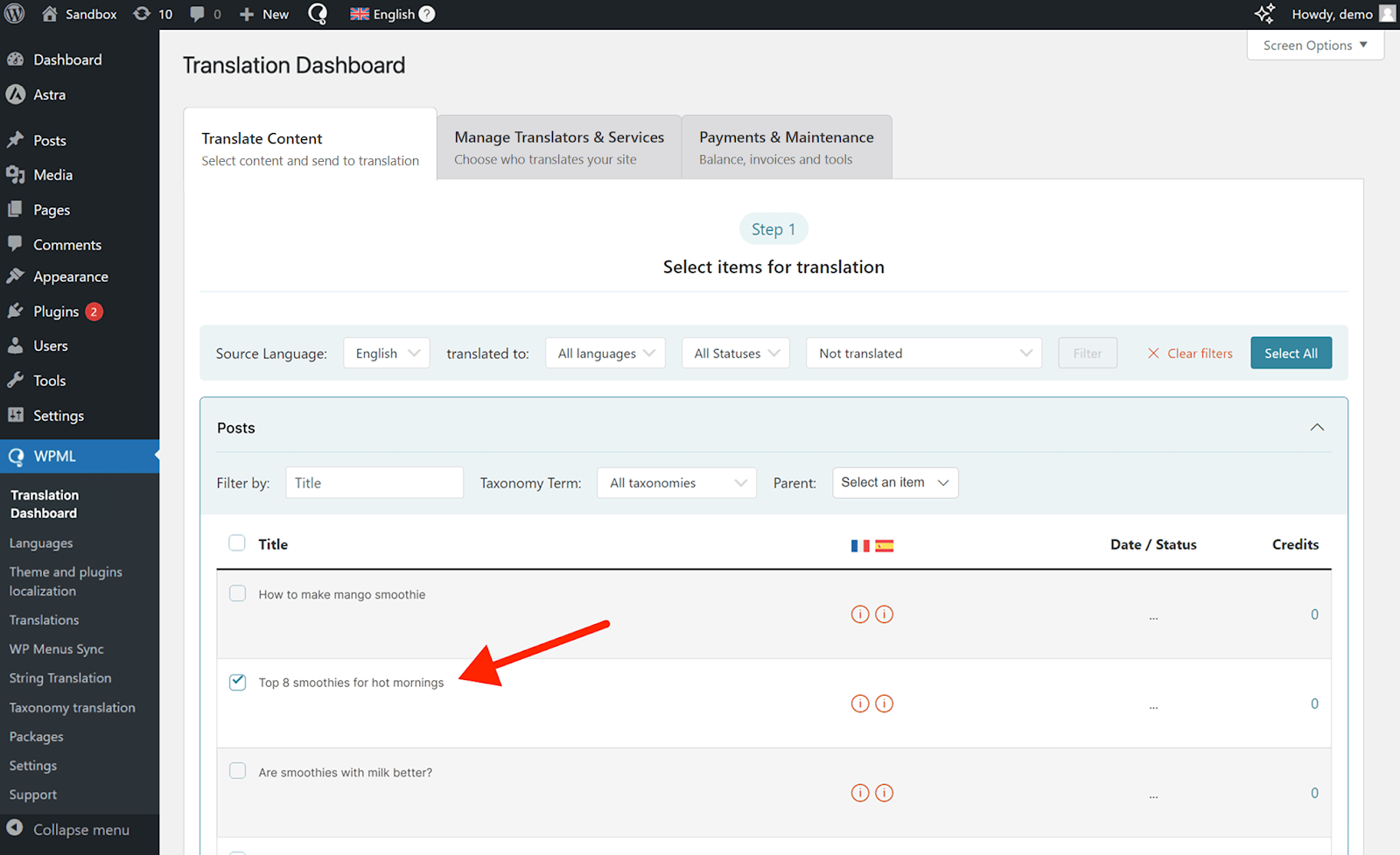 To translate on-page SEO attributes with WPML, simply send your content for translation. WPML translates attributes along with the page or post they’re associated with.
