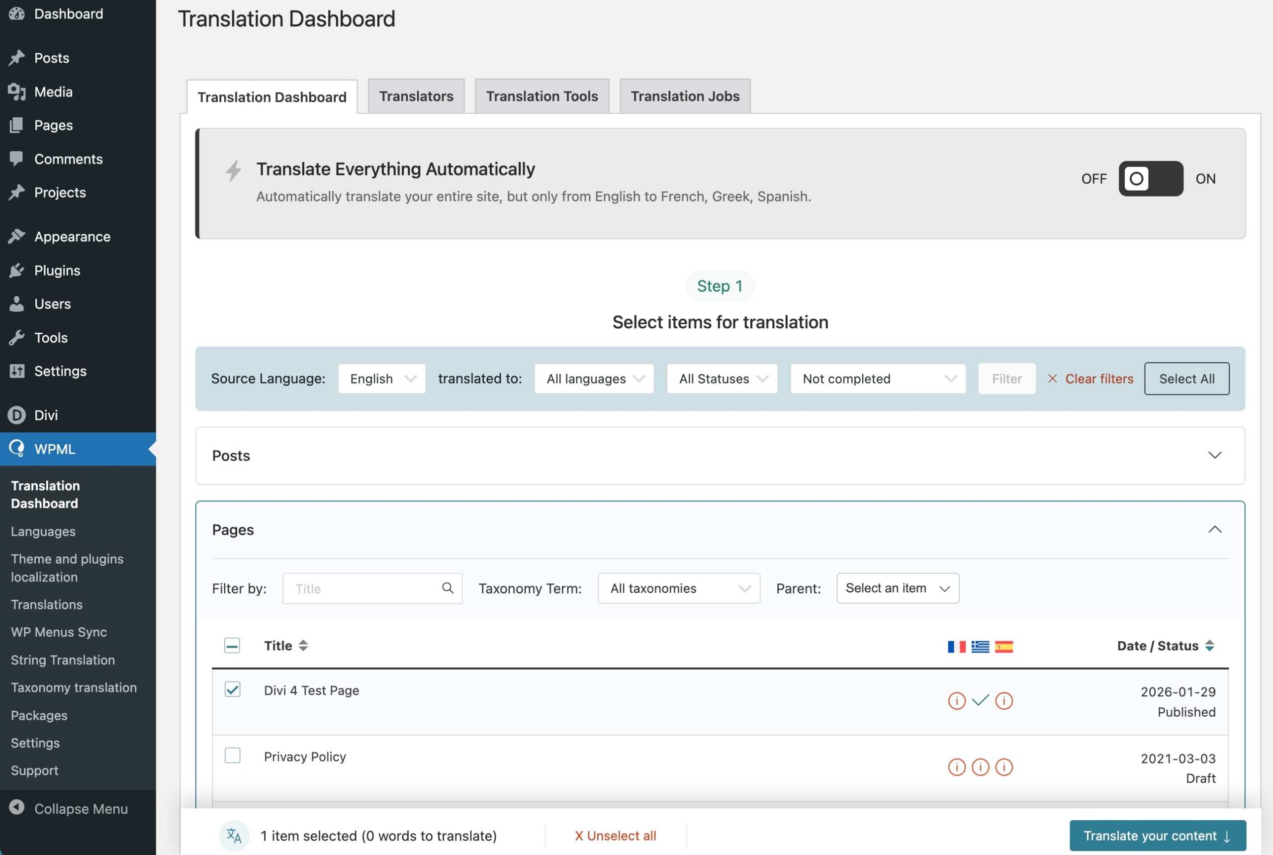To translate, go to WPML → Translation Dashboard and find the page under the Pages section. Select it and click Translate your content to select the translation method. If you have automatic translation credits, you can translate this page automatically in minutes.