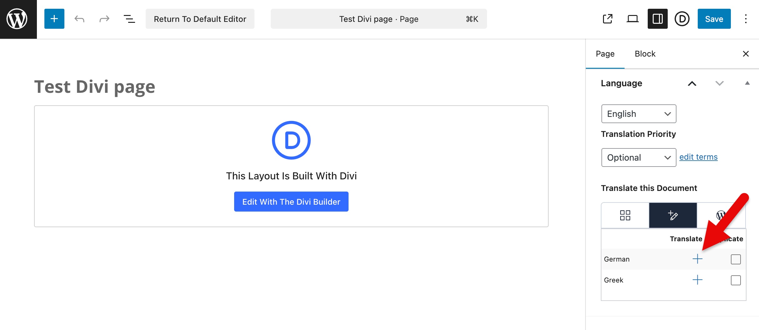 4. To translate the page with the button, you can use the Translation Dashboard. An alternative is using the Advanced Translation Editor (ATE), which can be useful when testing — it allows you to see the module tag for every Divi element on the page. To open ATE, go to Edit the page and click on the plus icon under the Language Box in the right sidebar.