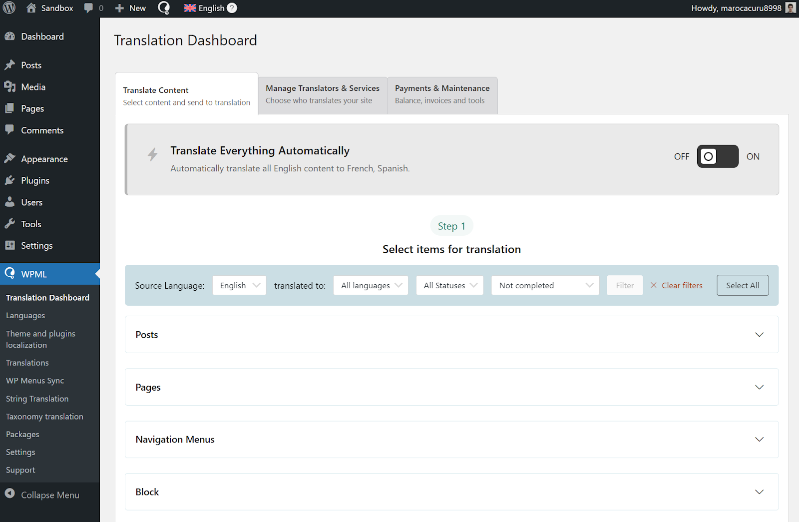 The Translation Dashboard is WPML’s central hub for selecting website content to translate and managing your translation progress.