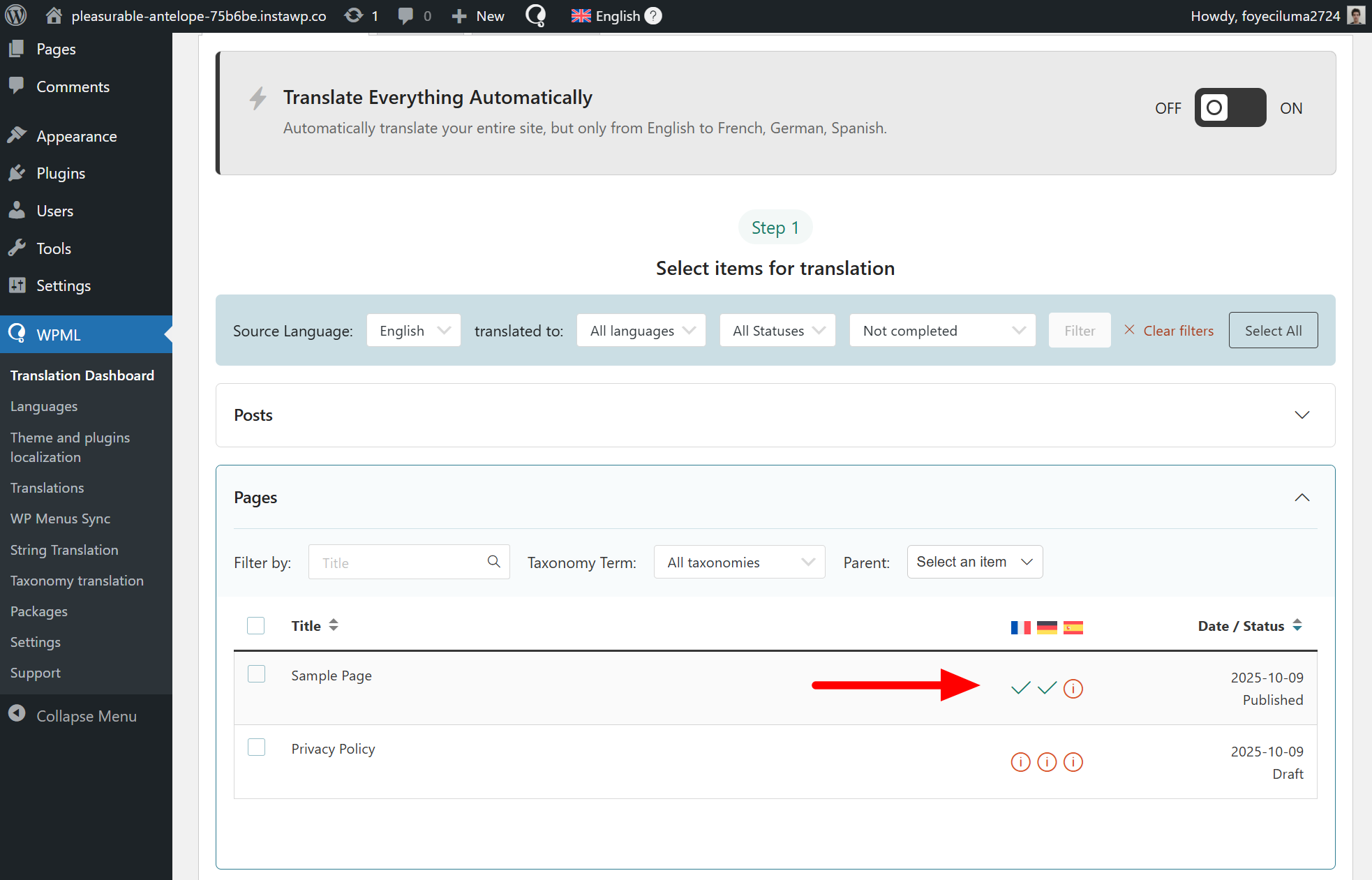 From now on, WPML will automatically publish completed translations on your website, indicating their status with a checkmark in Translation Dashboard .