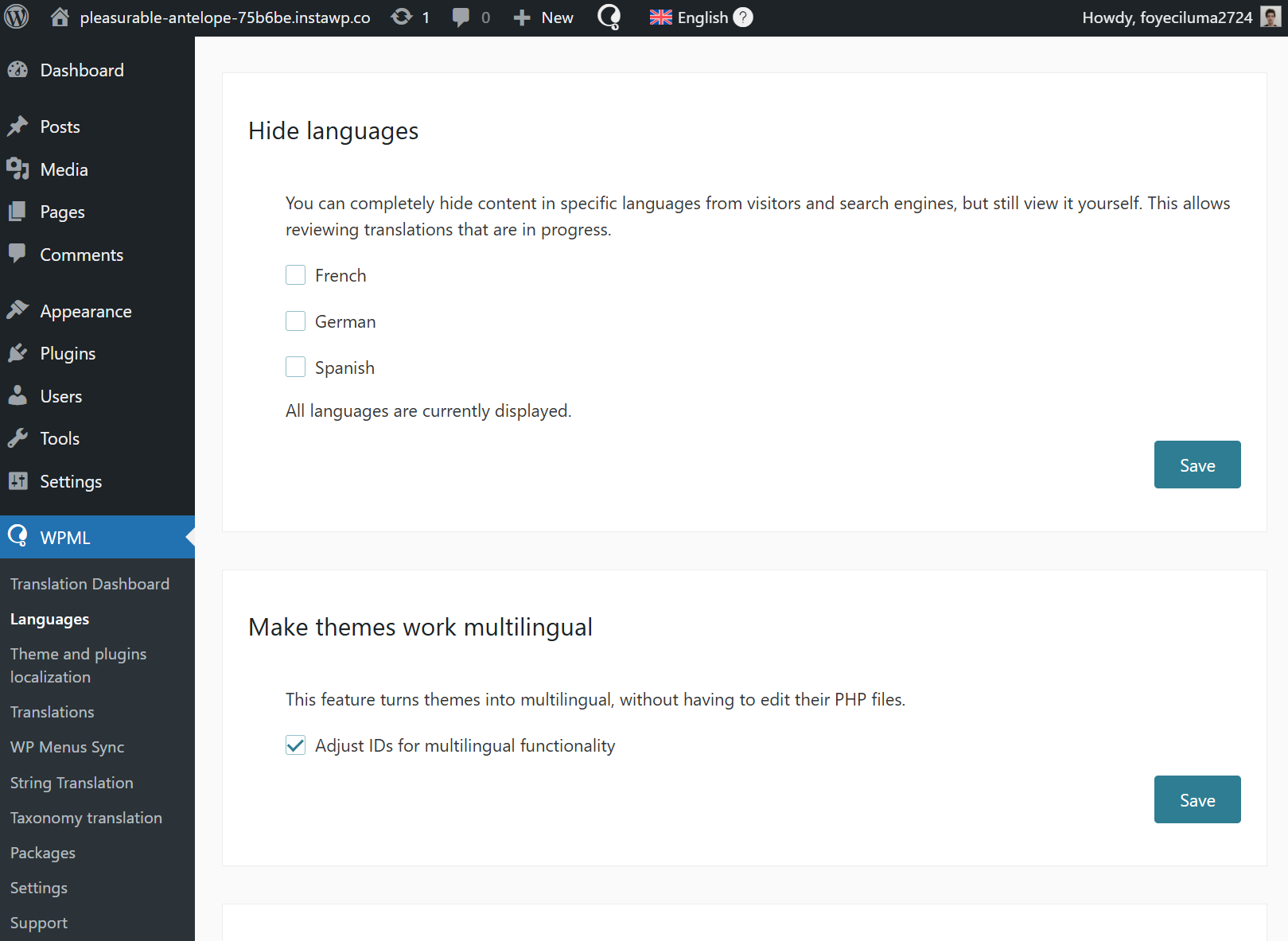 To hide languages on your website, go to WPML → Languages and scroll to the Hide languages section. Select the languages you want to hide and save your preferences.