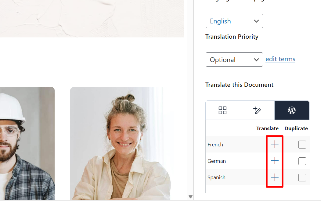 - Under Translate this Document in the right sidebar, switch to the WordPress Editor tab (icon looks like WordPress).