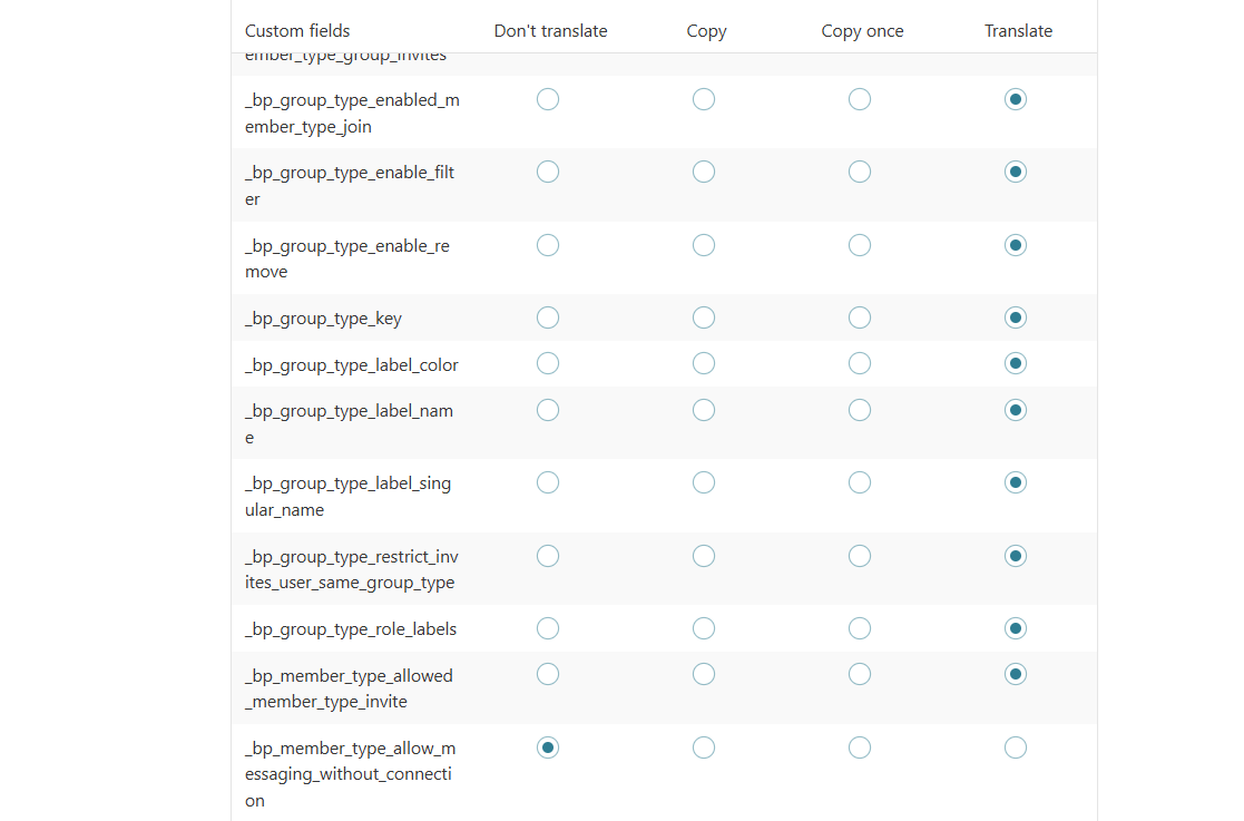 2. Asegúrate de que el campo personalizado que controla la visibilidad del tipo de grupo en el filtro esté configurado para copiarse en las traducciones. Esto se puede ajustar en WPML → Configuración → Traducción de campos personalizados. Encuentra el campo relevante y cambia su configuración a 'Copiar'.