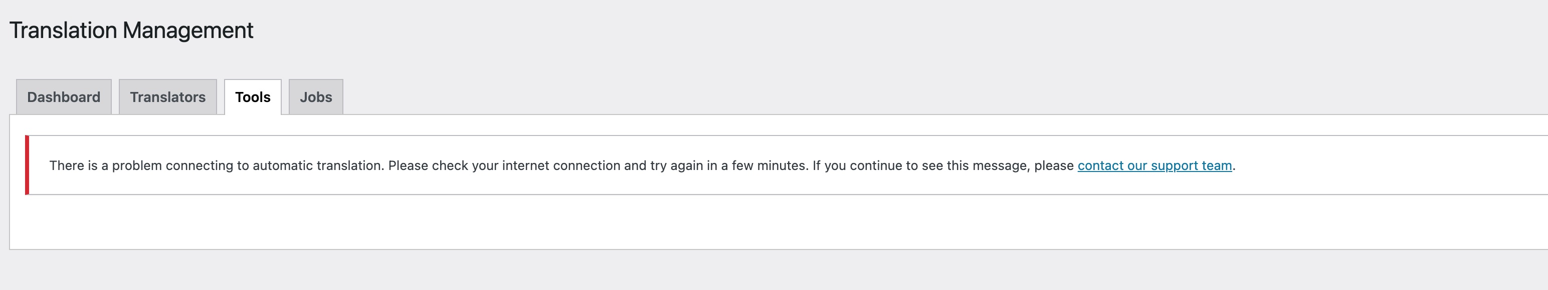 parece que ya funciona correctamente. Lo que continua sin funcionar es el que cuando accedo a WPML -> Administración de traducción -> Tools sigue apareciendo el mensaje de error que de adjunto como imagen.