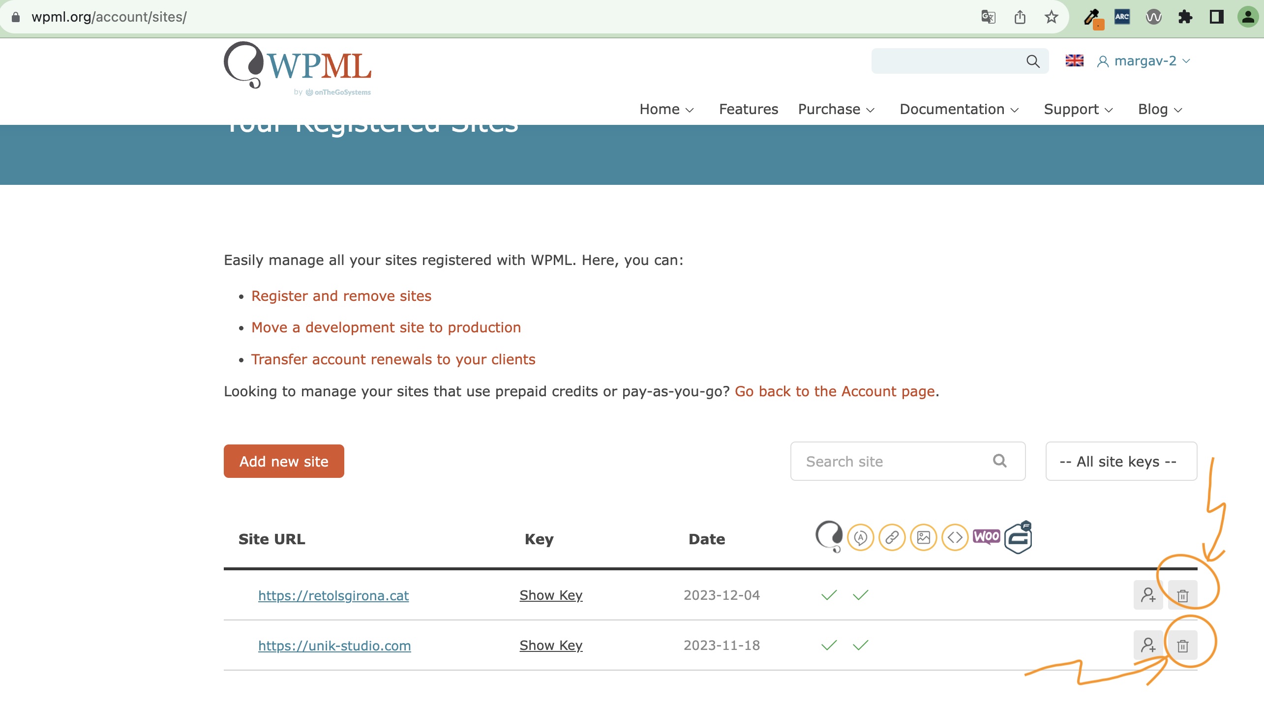 Por otro lado, estoy procediendo a realizar los pasos que me comentas pero tengo una duda cuando comentas "asegurate de borrar los dominios de tu cuenta WPML.org!". Debo eliminar los dos sites registrados? Te paso una captura de pantalla para que me confirmes este paso dónde marco si debo clicar aquí.