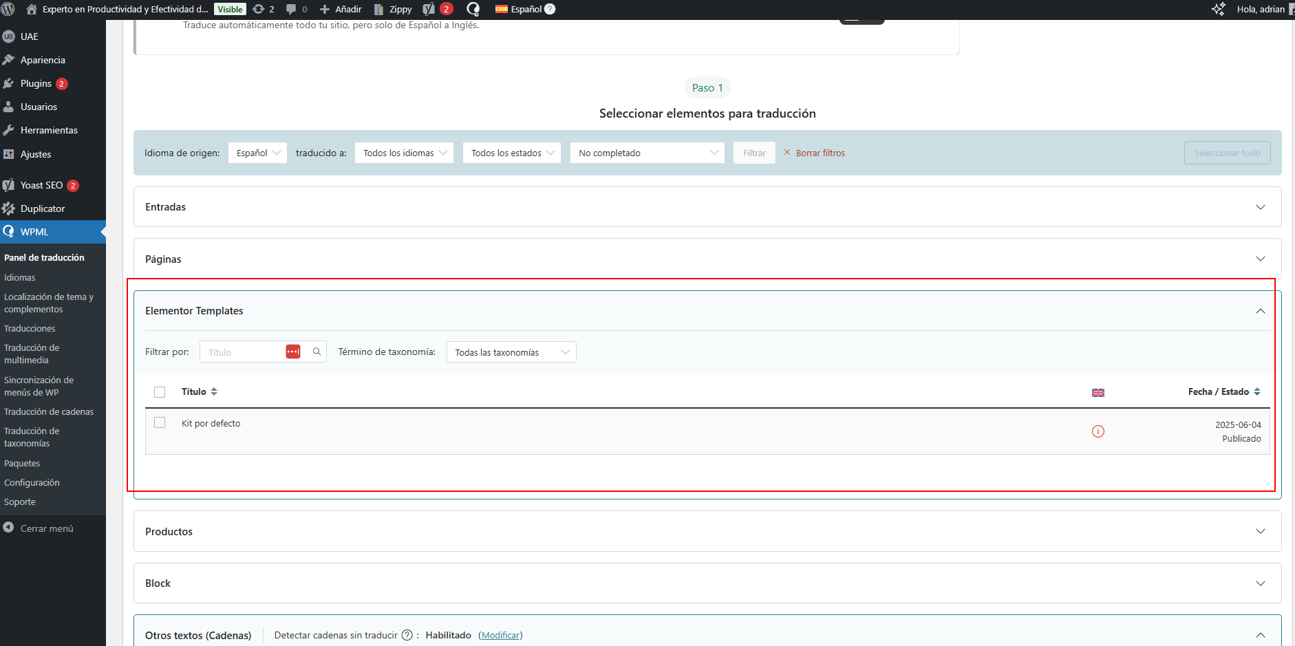 Hola En WPML > Panel de traducción Elementor Templates no aparece el elemento que quiero traducir. ¿Debo creoar una plantilla con ese elemento? Un saludo |