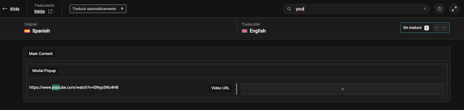 Hola, He ingresado al sitio y he abierto la traducción de la página de inicio. Por lo que puedo ver, la URL del pop-up aparece disponible para ser traducida. Utiliza el buscador para localizarla. Mira la captura de pantalla que adjunto por favor. Saludos cordiales, |