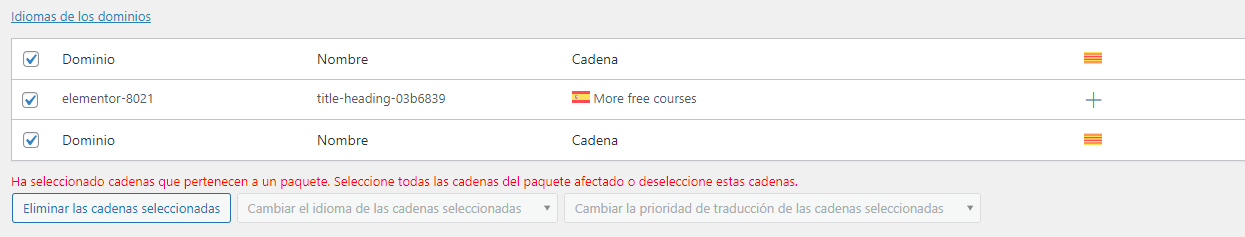 Si estás experimentando dificultades para traducir cadenas de texto en tu sitio web que utiliza el tema The7 y el plugin Elementor, y encuentras que el botón 'Cambiar el idioma de las cadenas seleccionadas' está deshabilitado en WPML->Traducción de cadenas, esto puede deberse a que las cadenas pertenecen a un paquete y no se pueden cambiar individualmente.