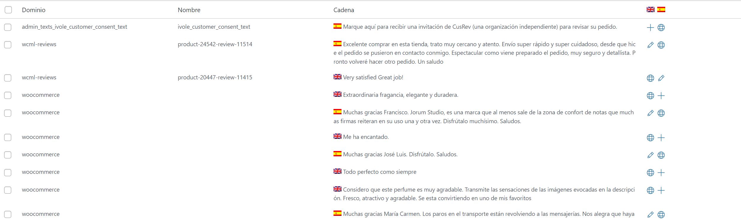 En la sección de reviews, veréis que aparecen las reseñas traducidas pero no las respuestas que aparecen traducidas en WPML, aunque he de decir que al contrario que las cadenas traducidas de wcml-reviews, las respuestas aparecen siendo del dominio woocommerce.
