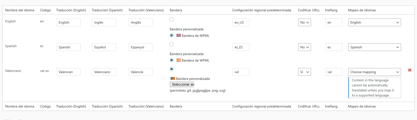- Ir a WPML → Idiomas → Editar idiomas → Añadir idioma y crear Valenciano con código val. Asigna un Locale válido, p. ej. ca-ES-valencia, y hreflang ca-ES-valencia.