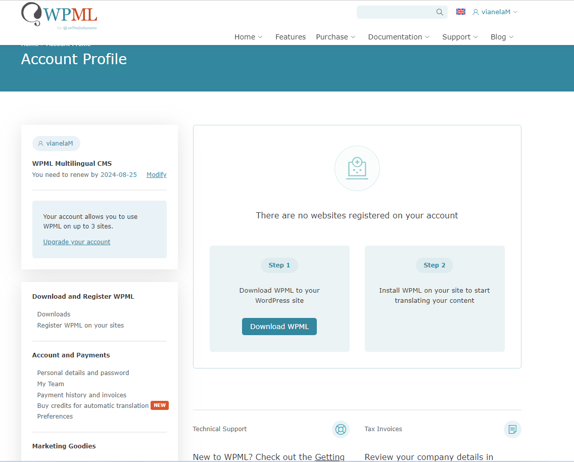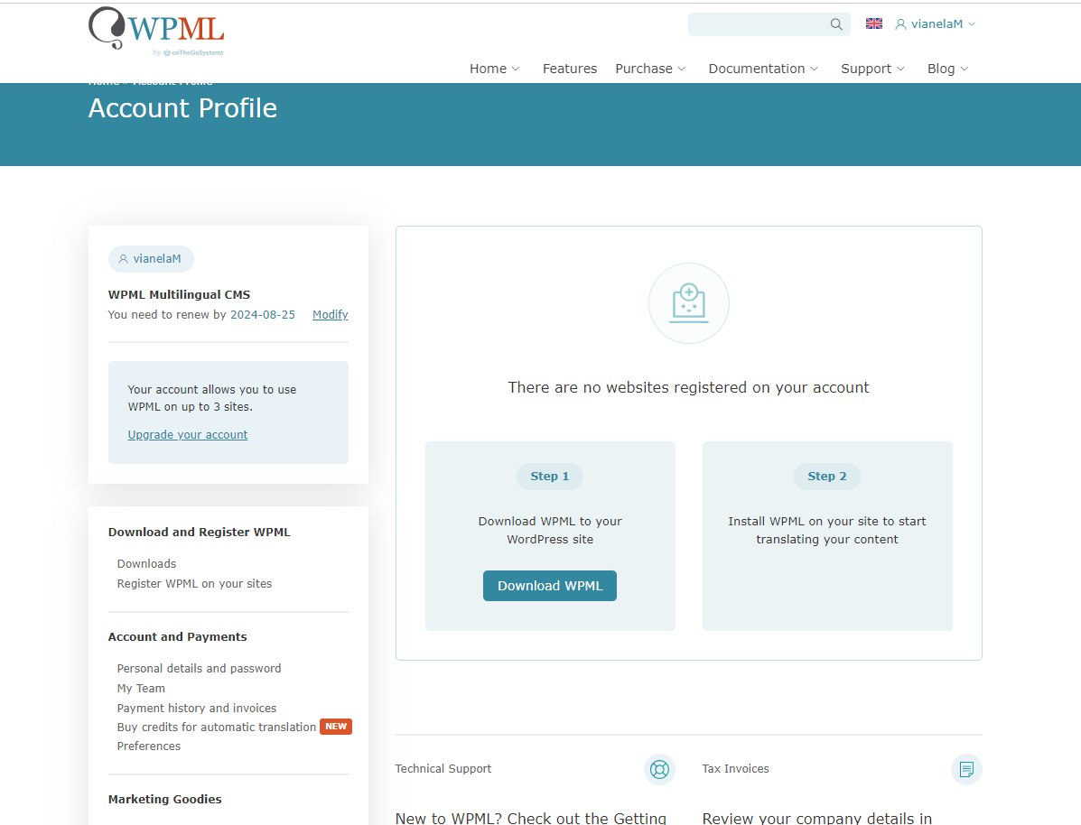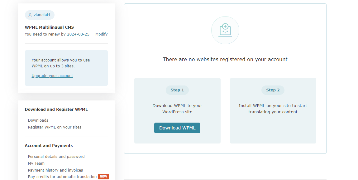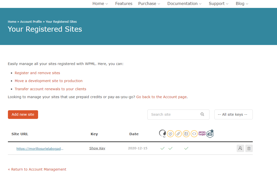 Ok, cuando accedo a https://wpml.org/es/account/ no me sale la misma pantalla que permite transferir y utilizar esos creditos. Incluso me dice que no tengo sitio registrado con el plugin pero si tengo mi sitio web con el plugin instalado. He adjuntado una imagen de como se me presenta el apartado que me indicas donde deberia poder transferir los creditos.