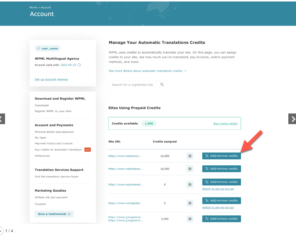 1- Estoy en el proceso de traducir mi sitio web a 2 nuevos idiomas y utilizare creditos de traduccion para usar la traduccion automatica. Sin embargo tengo entendido que mi cuenta al renovarse se obtienen cierta cantidad de creditos de traduccion para estos fines. Quiero saber como puedo visualizar cuantos creditos de traduccion tiene mi cuenta y tambien como podria transferirlos a mi sitio web he intentado encontrar estas opciones en el panel de WPML pero no me ha sido posible.