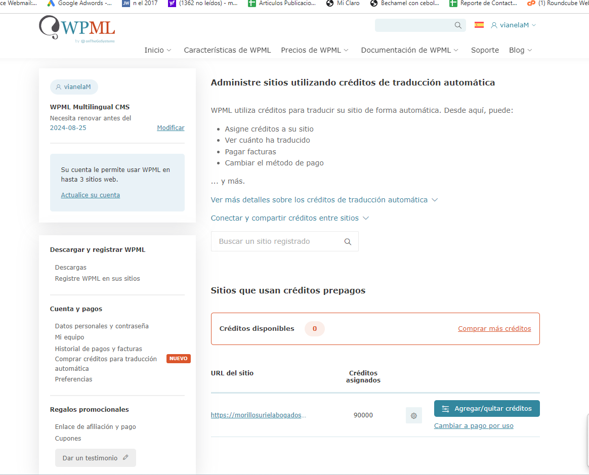 Problema: El cliente está en proceso de traducir su sitio web a dos nuevos idiomas y quiere usar créditos de traducción automática. Necesita saber cómo visualizar la cantidad de créditos de traducción que tiene y cómo transferirlos a su sitio web. Además, tiene problemas con el registro de su sitio en WPML, ya que le indica que no está registrado a pesar de aparecer en la lista de sitios registrados.