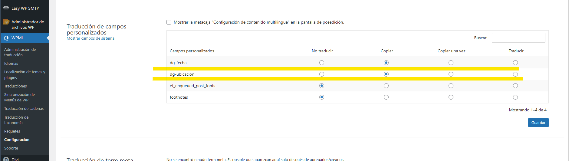 Tampoco funcionó en "CLUB PRIVAT" y lo solucioné traduciendo primero el contenido nuevamente y luego asegurándome de que el proyecto traducido use el nombre de campo correcto dentro del widget Divi que muestra los campos personalizados. Necesitaba editar el proyecto traducido en Divi para cambiar los nombres de los campos.