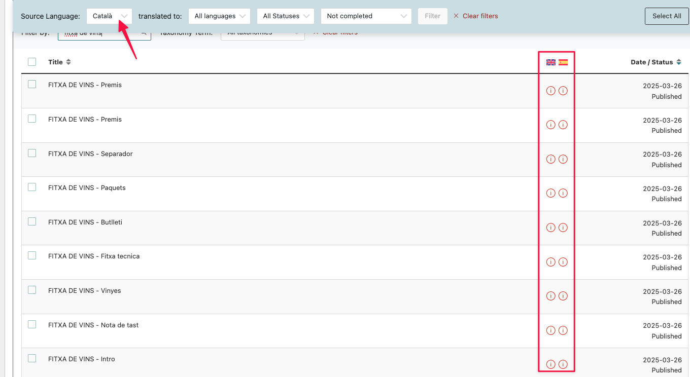 Hola, Gracias. Por lo que puedo ver, las plantillas no están traducidas del Catalán a los otros idiomas. Mira la captura de pantalla que adjunto. En WPML -> Translation Management asegúrate de filtrar por idioma. Saludos cordiales, |