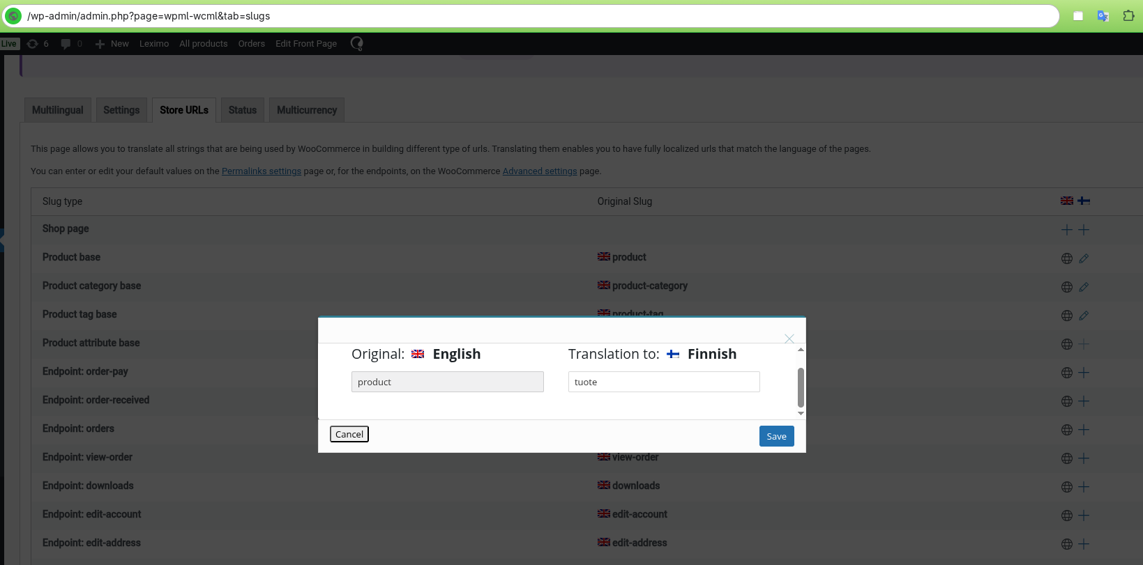 En la captura de pantalla sí lo puedo traducir, pero eso no funciona, queda en /fi/products/... aunque debe ser /fi/tuote/...