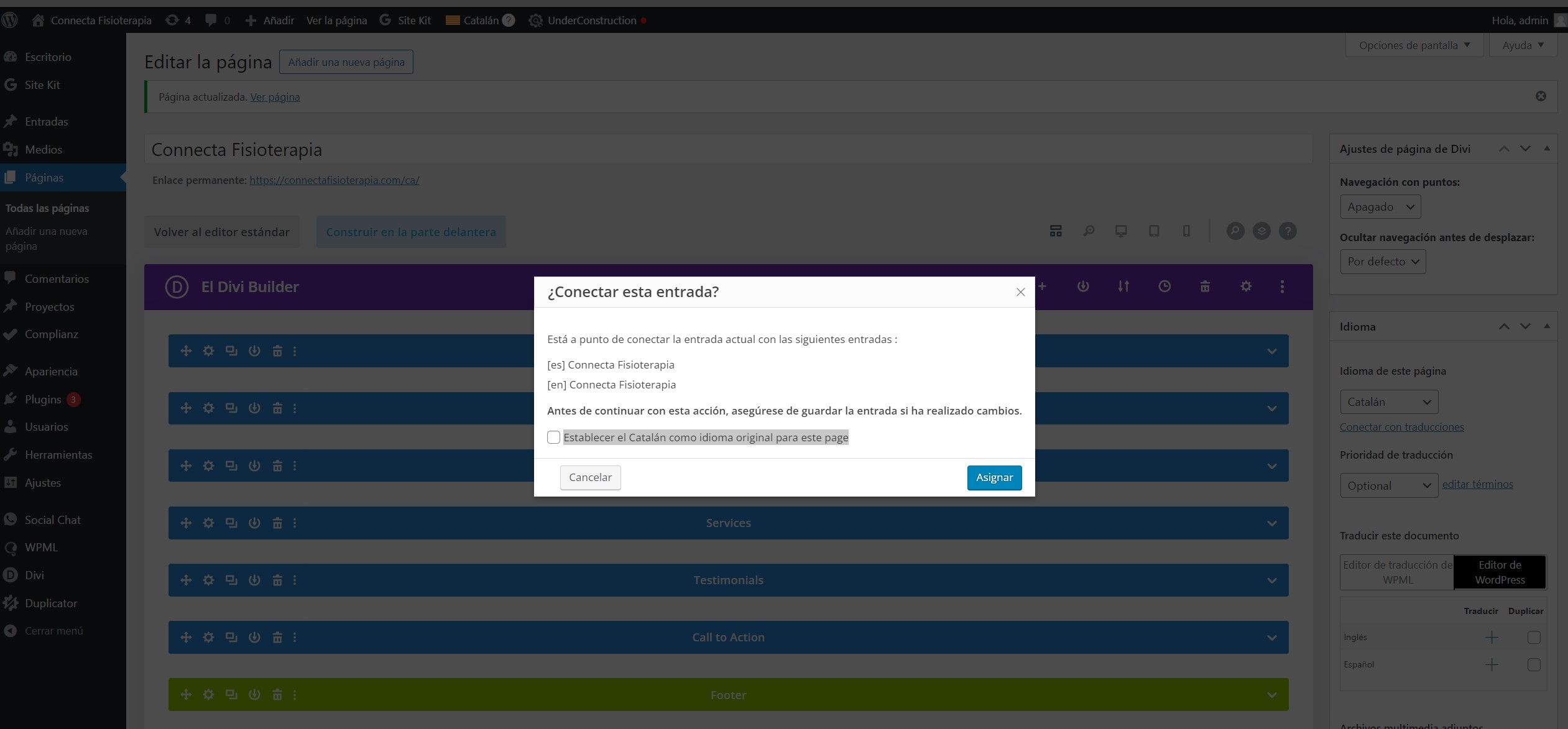 Una vez tengo los idiomas desconectados del catalán voy al catalán de nuevo para asignarlo como traducción del español. Al conectar me sale el recuadro que has comentado de "Establecer el Catalán como idioma original para este page" . No entiendo si que tengo que marcar esta opción o no. Entiendo que no porque quiero que el español sea el original i las traducciones el catalán y el inglés.
