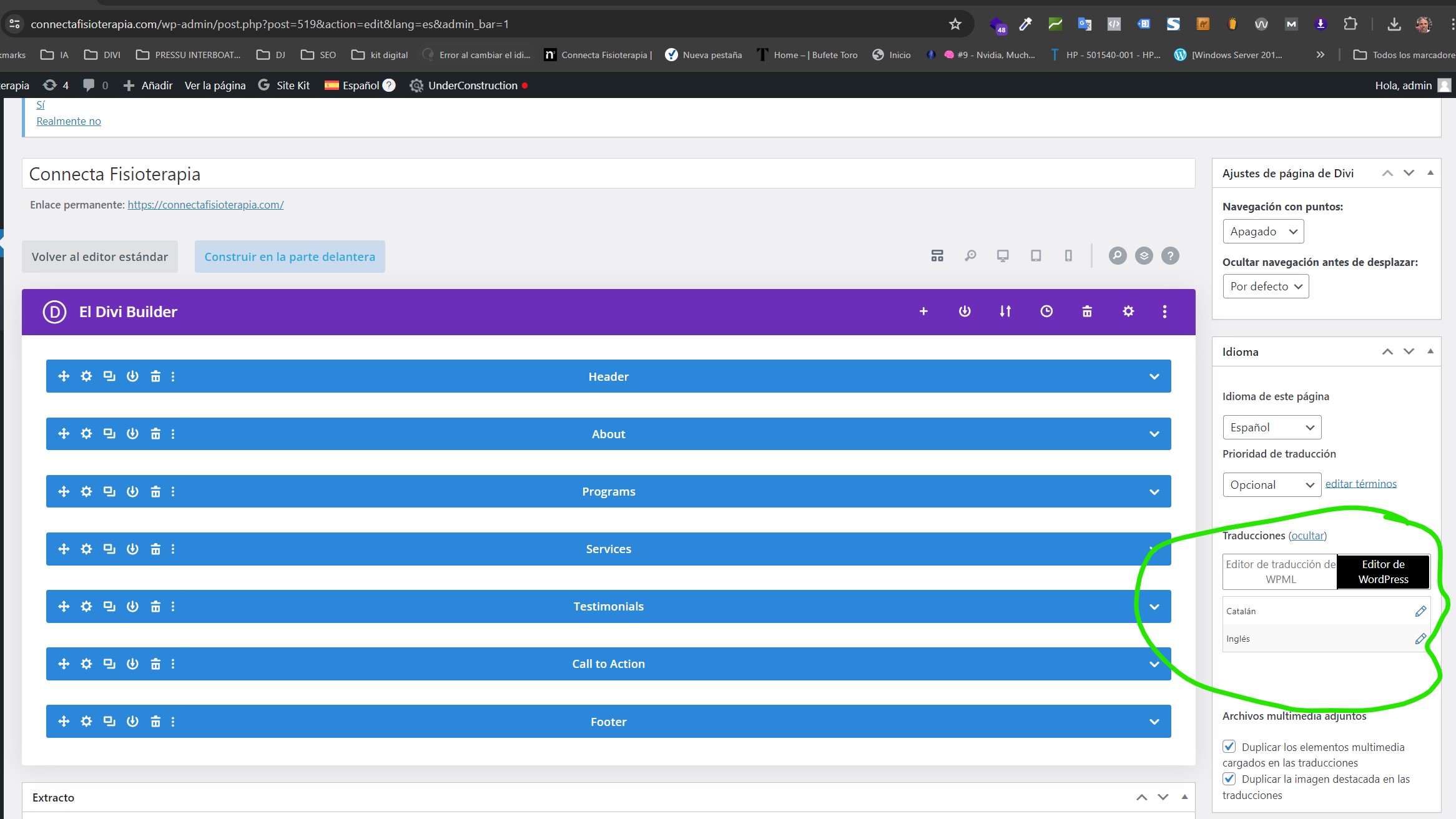 1. El editor de traducciones avanzado aun cree que el idioma por defecto aún es el catalán. Al intentar editar un contenido en español me aparece el mensaje: Advertencia: Está tratando de modificar una traducción con el editor estándar de WordPress, pero su sitio está configurado para usar el Editor de traducción de WPML.