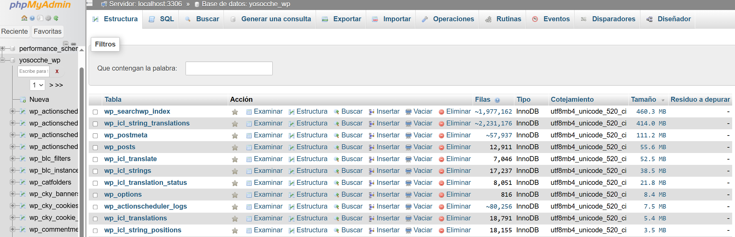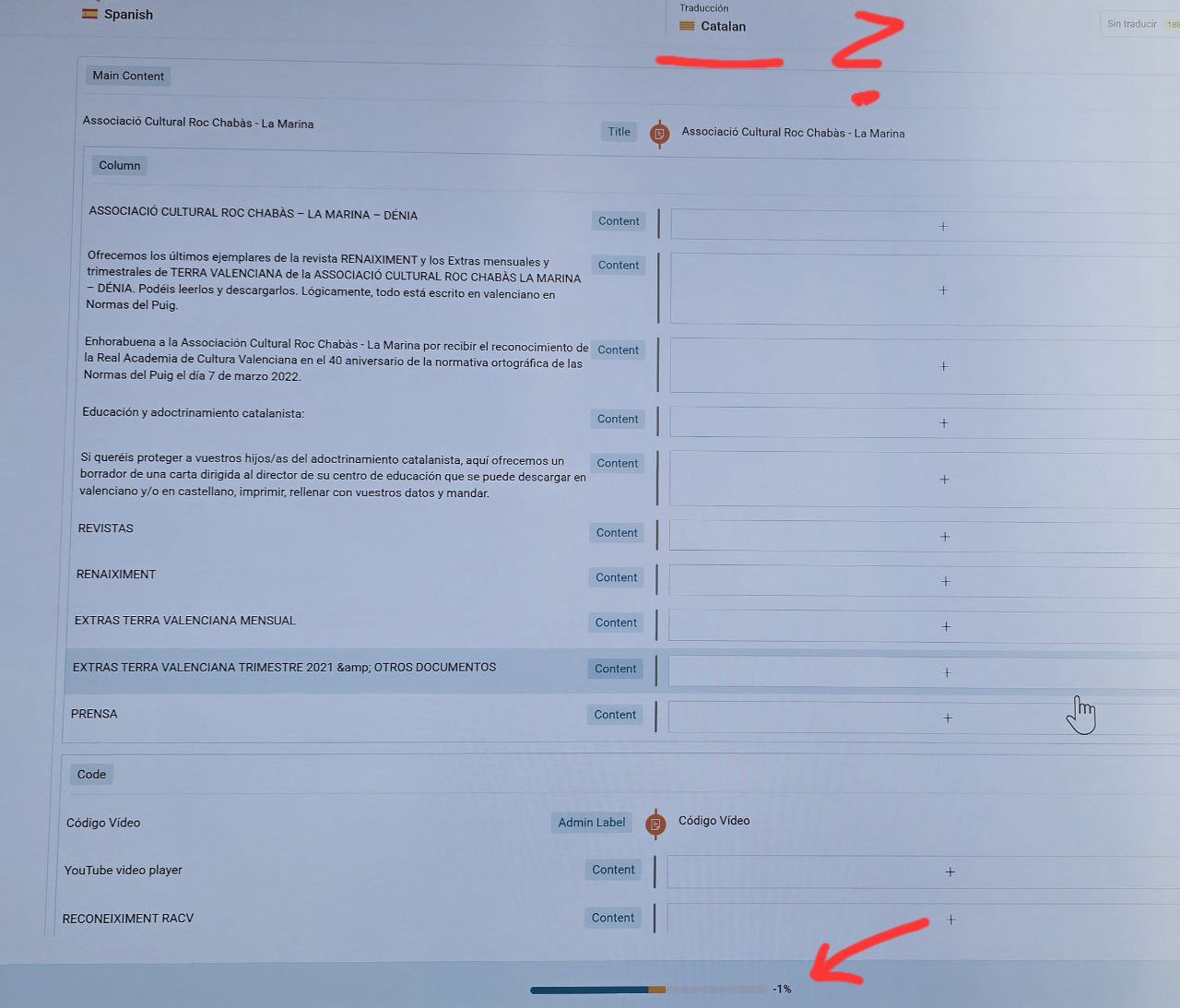 Hola Carlos. Desde el cambio de ajustes que has pedido hacer en la base de datos, al abrir paginas de traducción en valenciano de las páginas existentes de mi web (staging) me salen también en CATALÁN en el sitio staging. Además en el sitio staging he añadido en una de mis páginas (Associació Cultural Roc Chabàs – La Marina) 2 palabras en un titulo de una sección para forzar que me pida una traducción y después de guardar el cambio de la página y pinchar en "traducción al valenciano" me abre igual que ayer en la página de producción, la pagina de traducción en CATALÁN (tarda tambíen 1 minuto aproximadamente para abrirla), completamente vacía con todas las traducciones desaparecidas, marcando -1% de la traducción realizada. Estos fallos se tienen que erradicar y hay que volver a ponerlo todo como estaba antes!! Lógicamente, no puedo aceptar que pincho para traducir en una lengua y que ahora en la página de traducción salga otra lengua que la configurada y elegida. Además de este fallo sigue dando vueltas el circulito de WPML de "Processing media en posts" que se queda en 0% en la barra superior del escritorio. Hay que cambiar algún ajuste para que deje de hacer esto? Mis posts no se traducen y solo tiene una imagen destacada cada post. En general ves bien los ajustes como tengo el WPML en mi web o cambiarías algo para que me funcione mejor? Por que tengo una tabla "wp_icl_string_translations" que pesa tanto (más de 400Mb) y con tantas filas y que sigue creciendo día tras día sin cambiar nada en la web? Se puede hacer algo con este problema? Un saludo, |
