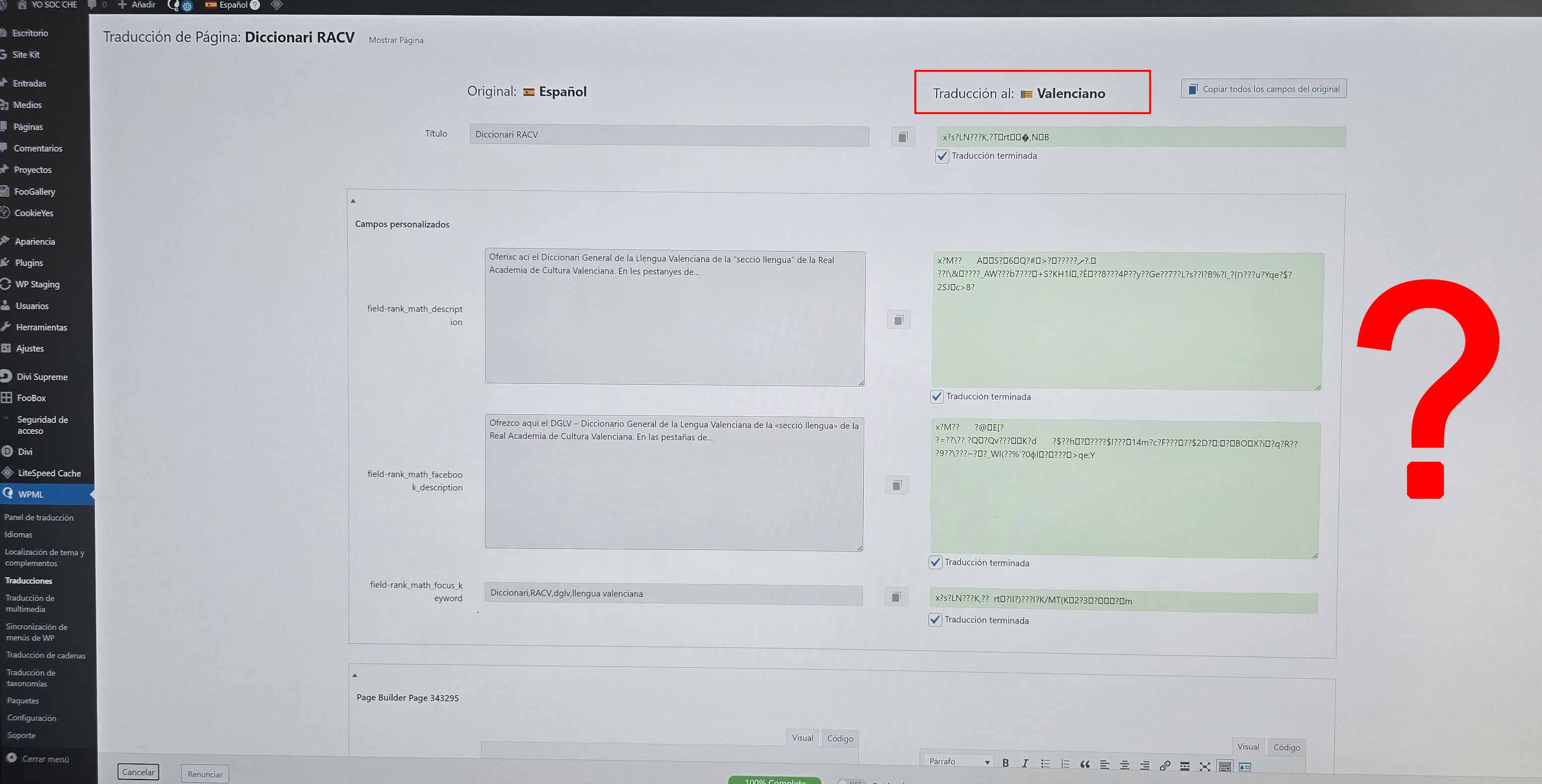 Buenos días Carlos y feliz Lunes! He conseguido recuperar mis traducciones y ahora todas las páginas estén en valenciano! Las 2 páginas que todavía indicaban que estaban en Catalán cuando entrabas en su traducción en valenciano, "Documentos" y "Yo Soc Che - Inicio", marcaban "En Espera del primer traductor disponible" y se me ocurrió entrar en el "Panel de traducción" y cancelar estos trabajos. De esta forma las 2 páginas volvían a mostrar la lengua correcta (valenciano) y sus traducciones completas. Así que esto bien! Parece que es un bug en WPML. He cambiado algunas cosas en en le contenido de las 2 páginas para ver si funcionan las traducciones y si que funcionan. A veces después de completar la traducción al 100% y guardarla se queda marcada la traducción con el icono de engranaje (Traducción de Valenciano en espera del primer traductor posible) durante varias horas y no se actualiza la lengua traducida en frontend hasta entonces. Siempre he traducido y traduzco las lenguas yo mismo y me gustaría apagar por completo todo que tiene que ver con la traducción automática, pero no se como conseguirlo. Me lo puede indicar? Del mismo modo sigue la ruedecita azul de "Processing media in posts" dando vueltas y siguiendo al 0% - 0/111. Saludos, |